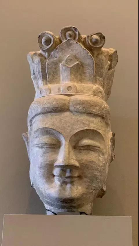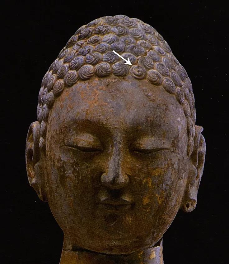 细腻,工艺无疑是高等级的,像主的身份也一定非富即贵。但满头的螺发却有一处特别的形态,为