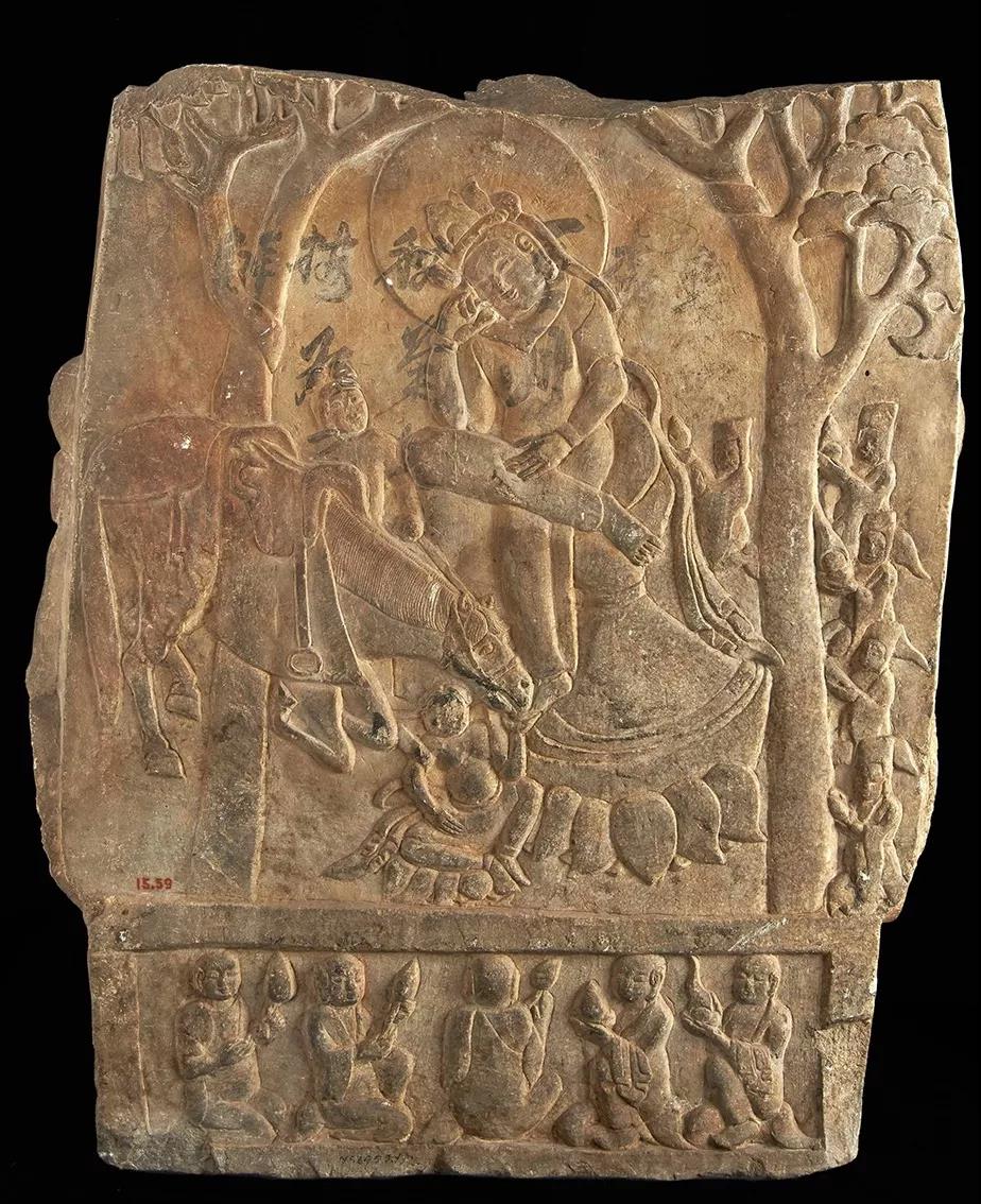 萨。背面的思惟菩萨半跏趺坐于筌蹄,白马舔其足,这也是经典题材,总体为北齐时代的标准样