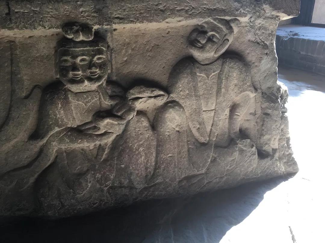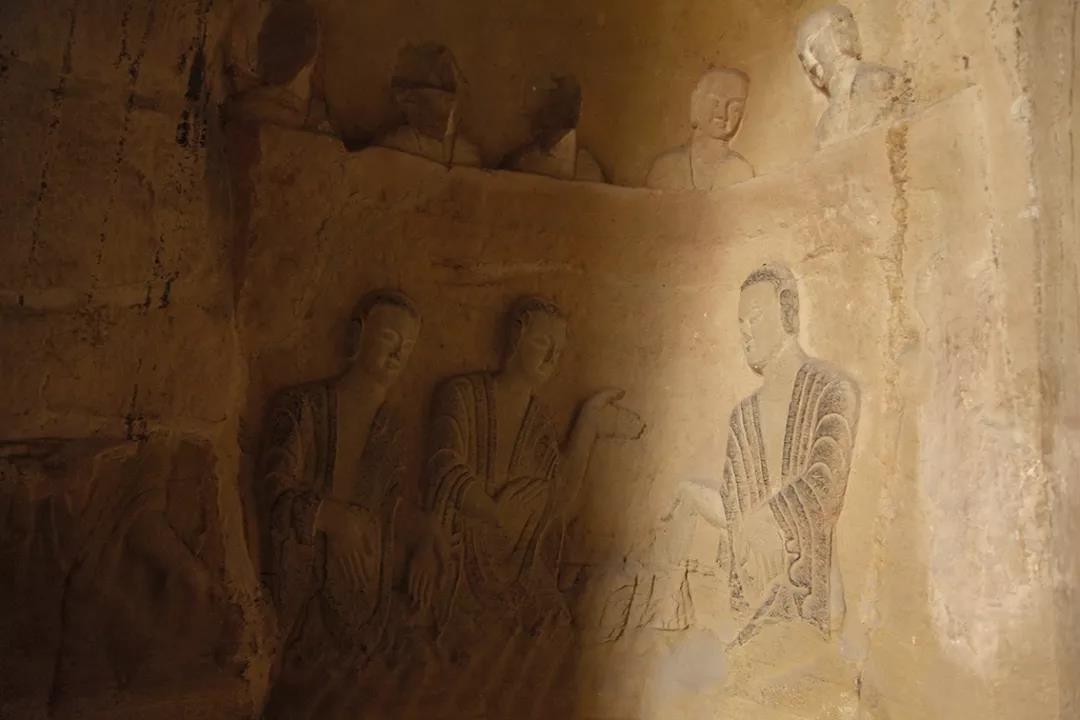 这是巩县石窟的一个角落,从中可见有三佛弟子(暂定为佛弟子)在交谈,并有手势在比划,之所