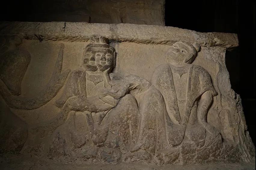 这种三人交谈的场面是很少见的,这是否是二佛并坐的经典题材的改造?出现第三人,这是不寻常