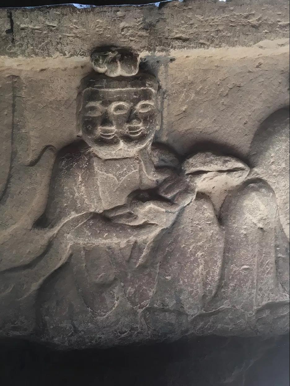 这个巩义石窟中的双面人像位于台座的基座下,与各种神王并列,发有髻,笑容恬美,身着交叉帔