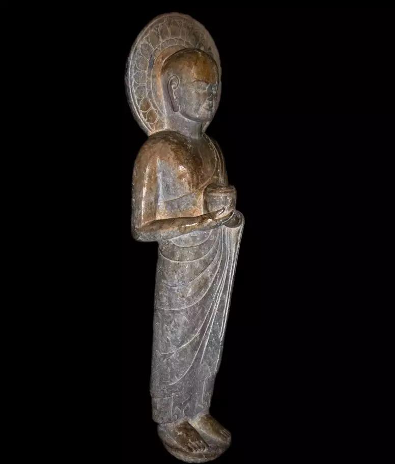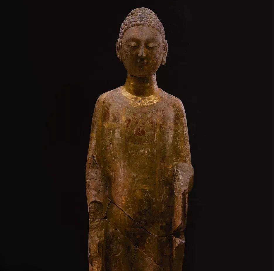 这尊北齐的法界人中像是青州龙兴寺窖藏坑出土,佛像身着通肩式大衣,有彩绘与贴金工艺,打磨