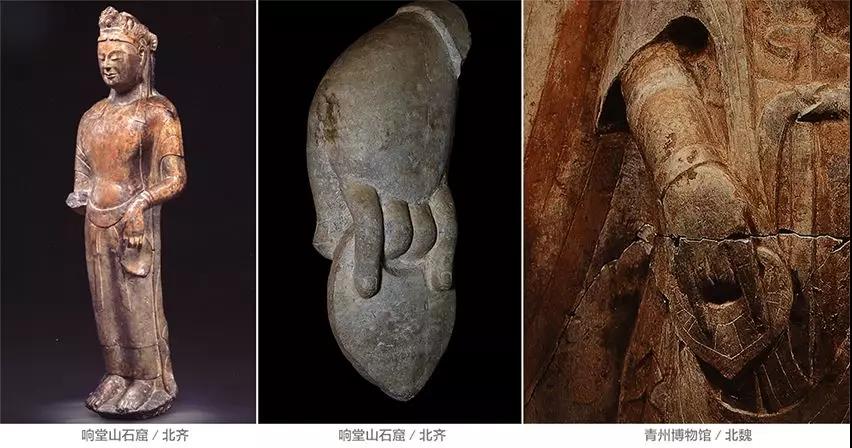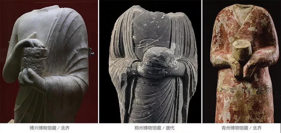 体的曲线结构,青州式就有诸如此类的例子。我们常见的半跪姿弟子群像都是左右对称式,中间