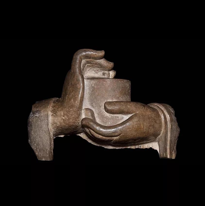 龙门石窟中有许多比较奇特的手印,其所指早已无从考证,这里选出一例掌心朝上的手印作为例子。