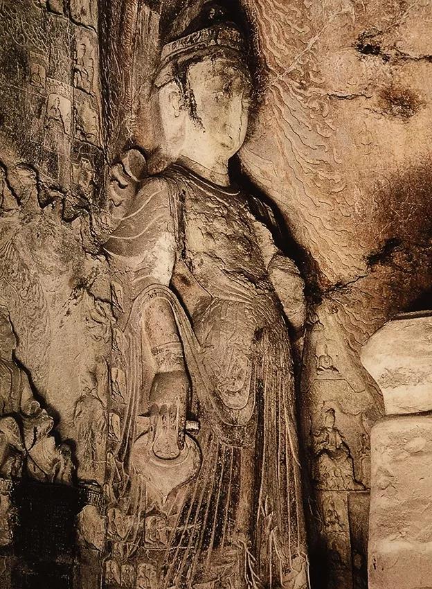 龙门石窟古阳洞的正壁右壁有尊菩萨像手持的法器上特意雕凿了一个小天人,从莲华里化生出来,