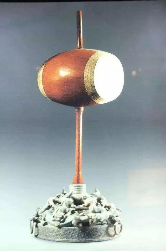 汉代建鼓多以流苏羽葆为饰。室内演奏时,将直贯鼓身的木柱插入木座,双手执棰