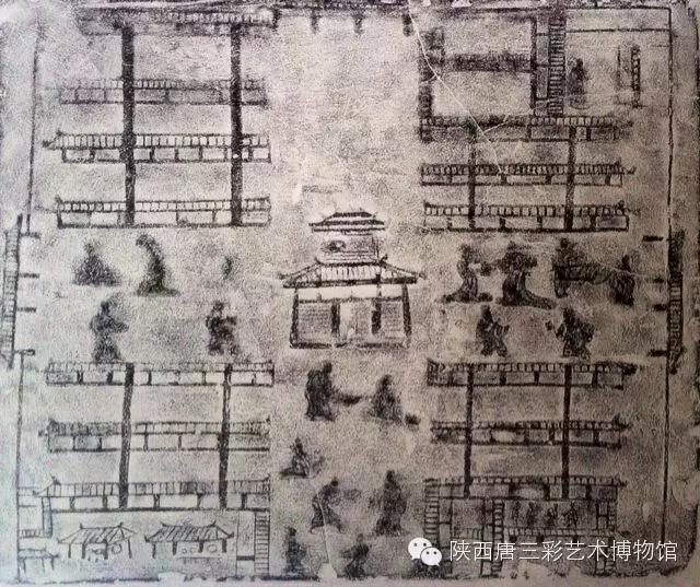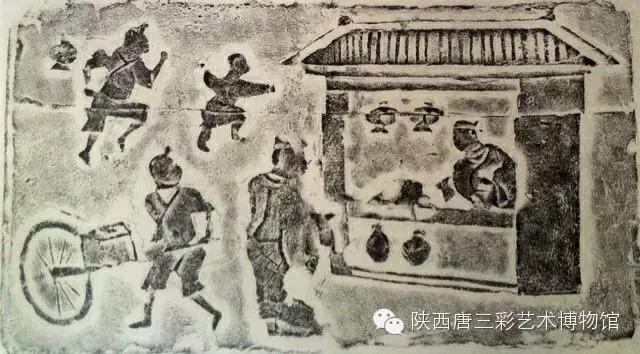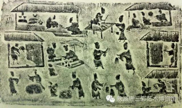 时击鼓为号;市井东、西、北三面皆有墙,隶书"东市门"、"北市门"表明此为封闭式市场;市