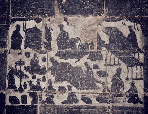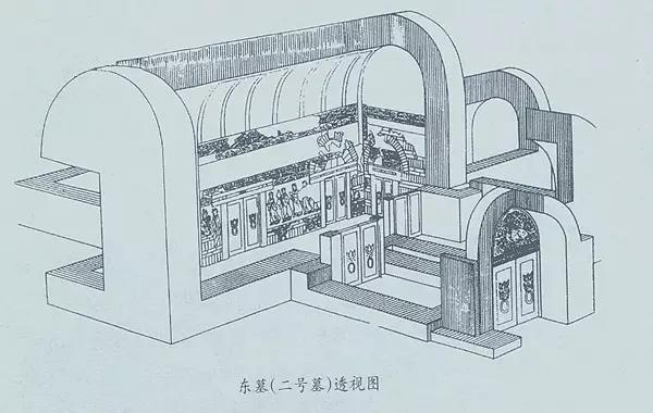 打虎亭汉墓由一座画像石墓和一座壁画墓组成,两墓均以巨大的青石和特制的大青砖砌券而成。地宫中保