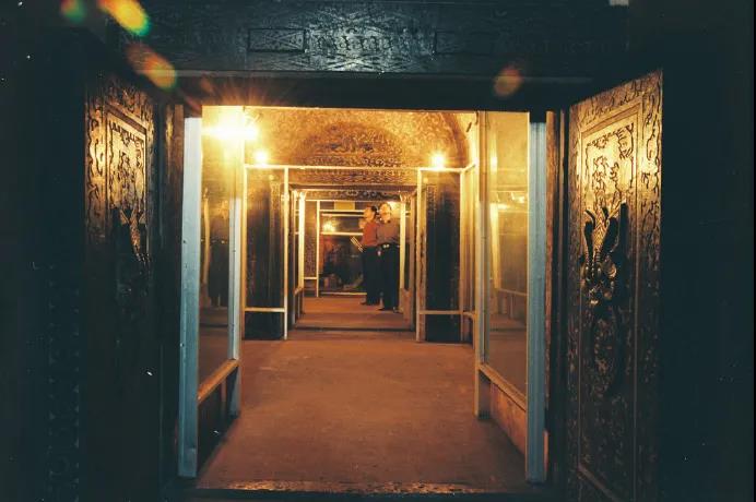 门扇,这是最具精彩之处。门扇高186厘米,宽108厘米,厚14厘米,正面背面都运用凸起、深减、浅