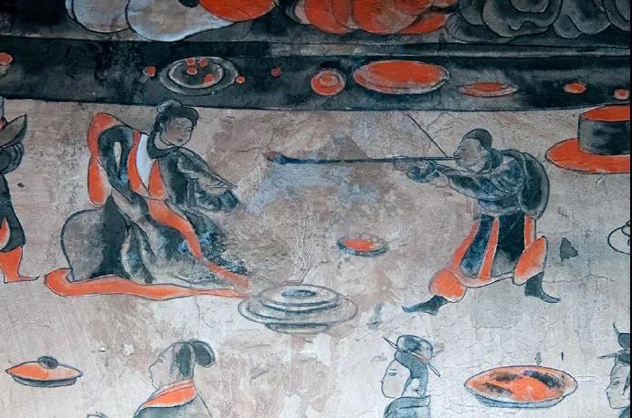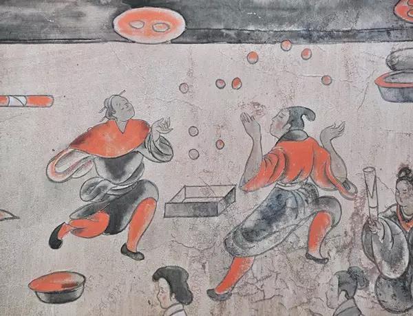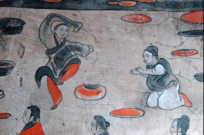 宴会中间的位置是“百戏”作乐场地,乐师在击鼓、敲锣、拍镲;演员在踏盘、载歌、载舞;杂耍者正在