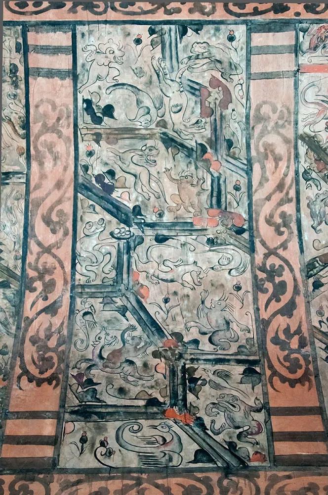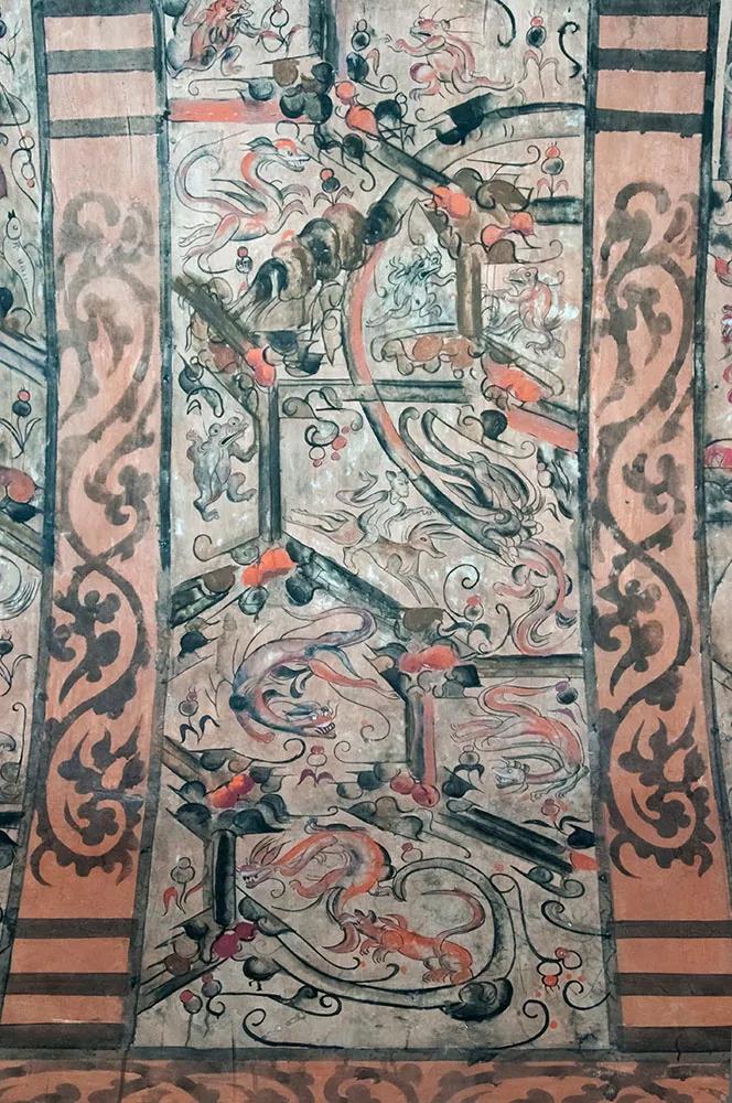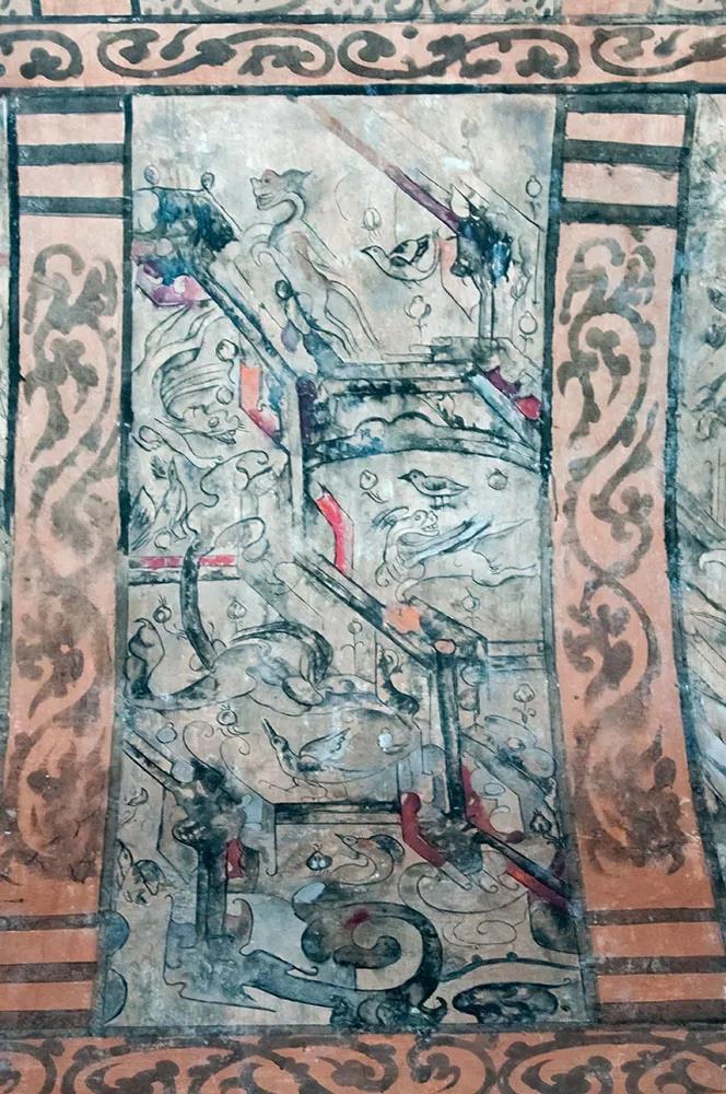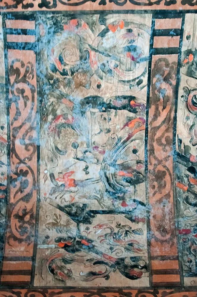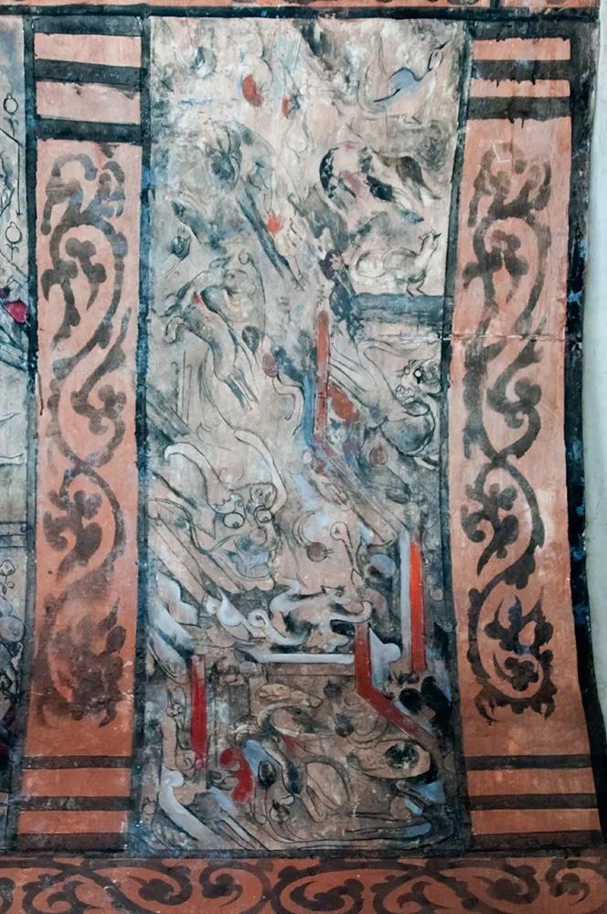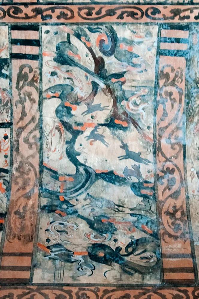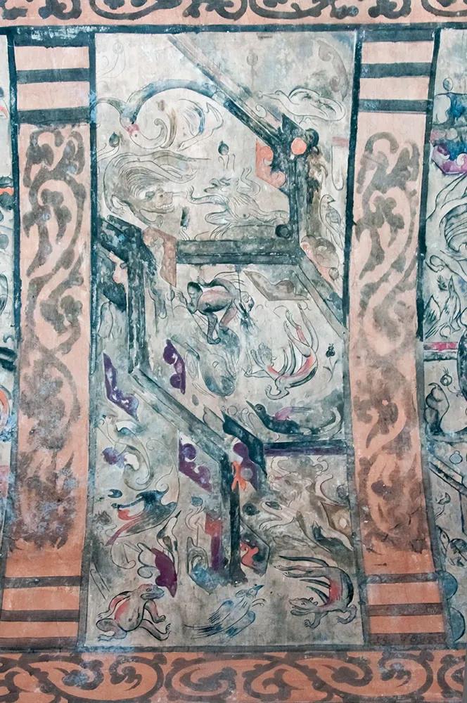上朱雀、下玄武、左青龙、右白虎。四象处云雾缭绕,神奇美妙,寓墓主人求四方天神保护之意。