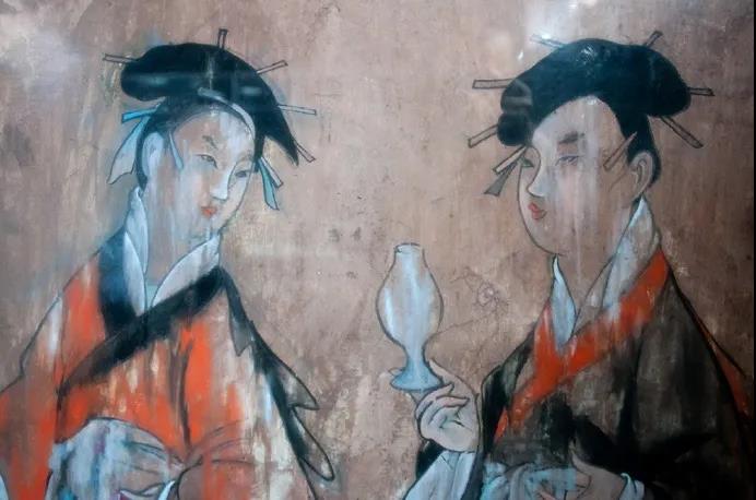 有一个褐色拱腿形几案,几案后两个并肩列坐者就是女主人。她们仪态高贵,雍容大方,似在有礼貌地应