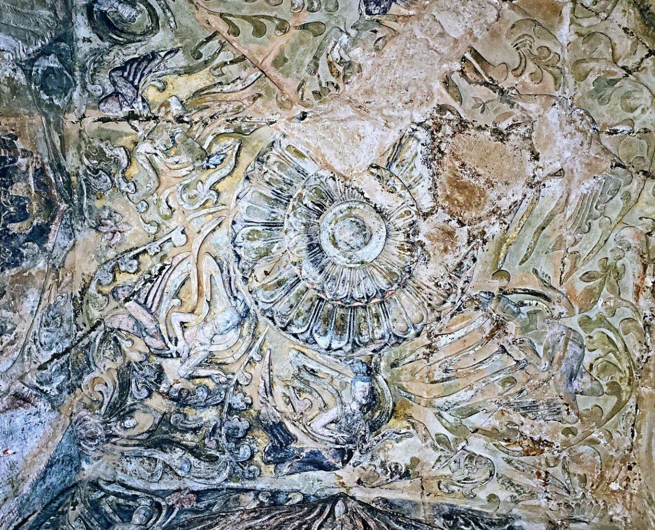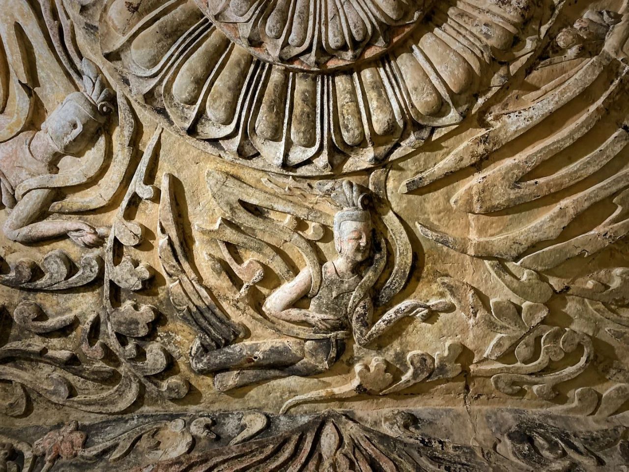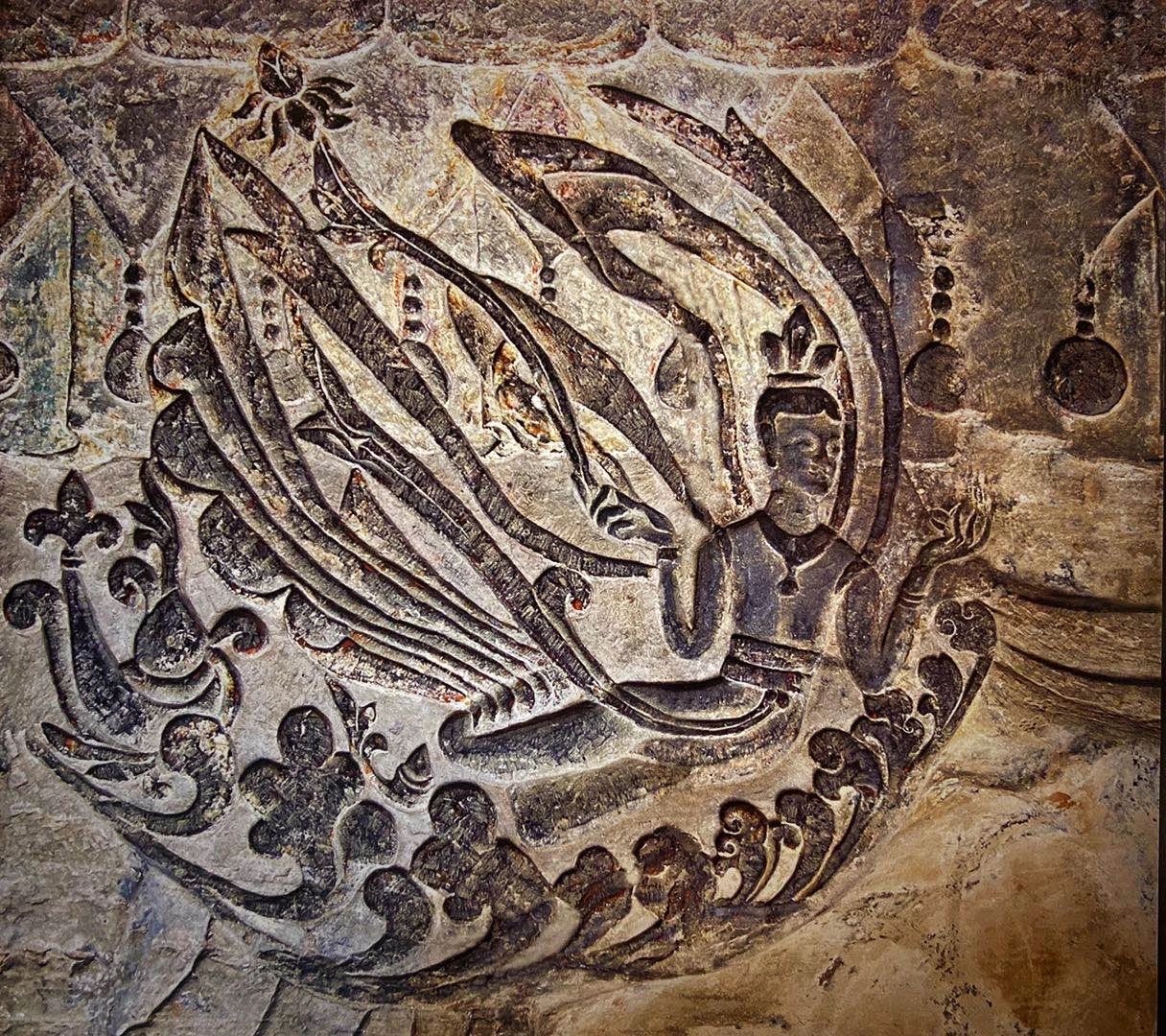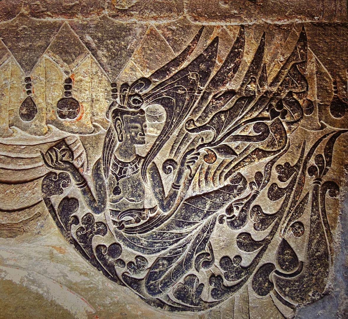 巩义石窟的飞天,主要分布在窟顶和佛龛四周,五个窟一共有飞天190余身,雕工的精致、风格独特,这些飞天最大的有七十厘米、最小的仅有三厘米。