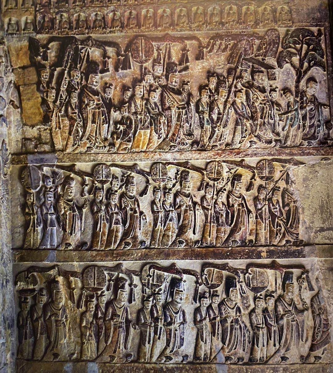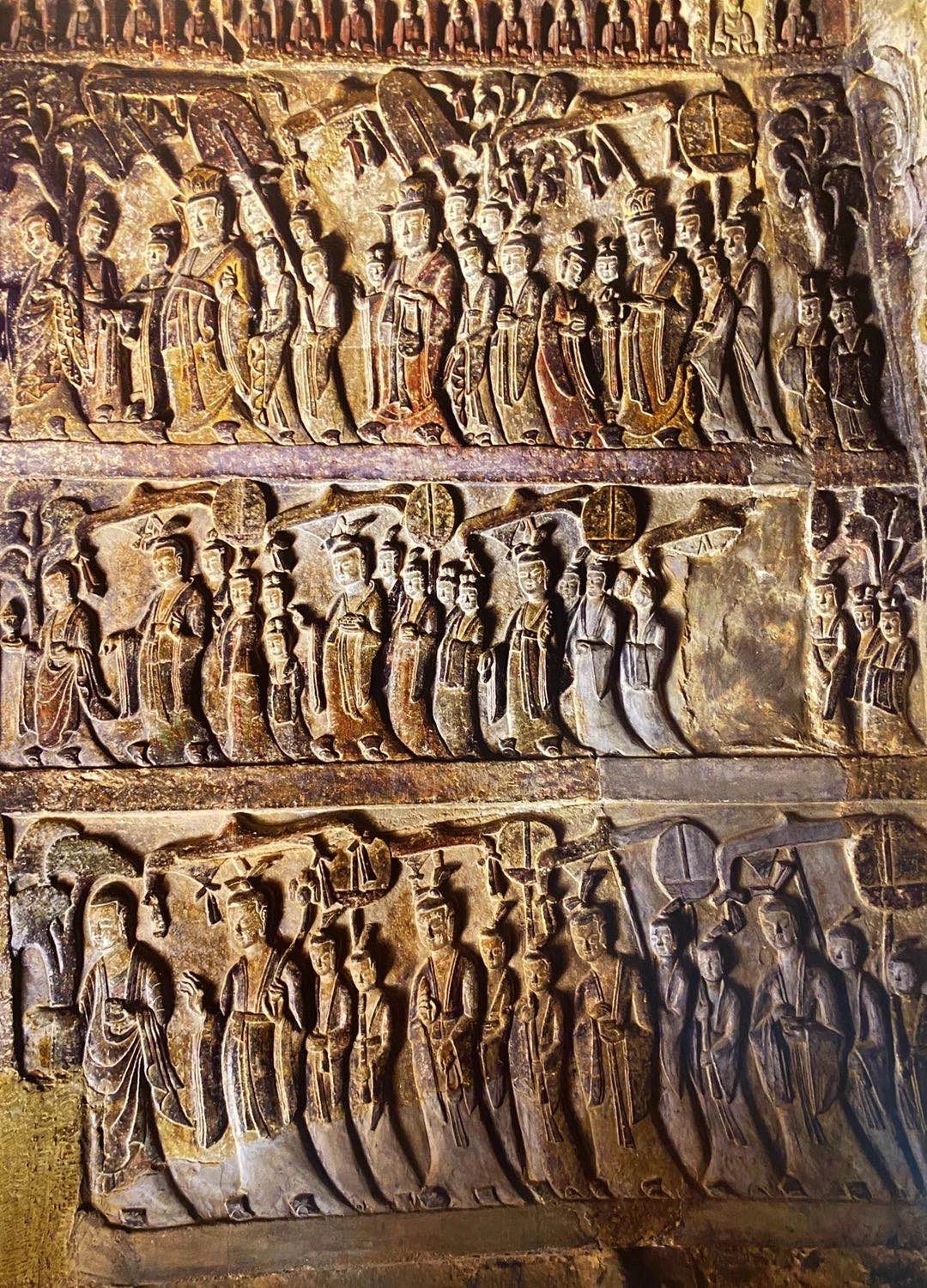 尤其是第一窟的帝后礼佛图保存的最为完美,经历千年之后,上面的彩绘颜色仍依稀可见,令人赞叹。一套完整的帝后礼佛图分为皇帝礼佛图和皇后礼佛图,两两对应,上下各三层。