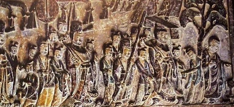 在此,工匠采用了非写实的手法,把皇帝及王公大臣的体型刻画的高大魁梧,而侍从则是瘦小低矮,设计者通过身体的比例和动作表情服饰的差异,来刻画处图中不同人物身份与地位的差异。画面中虽然人物众多,但远近层次处理的非常好,绝大多数人像都是朝一个方向前进的,是整个画面的和谐统一。