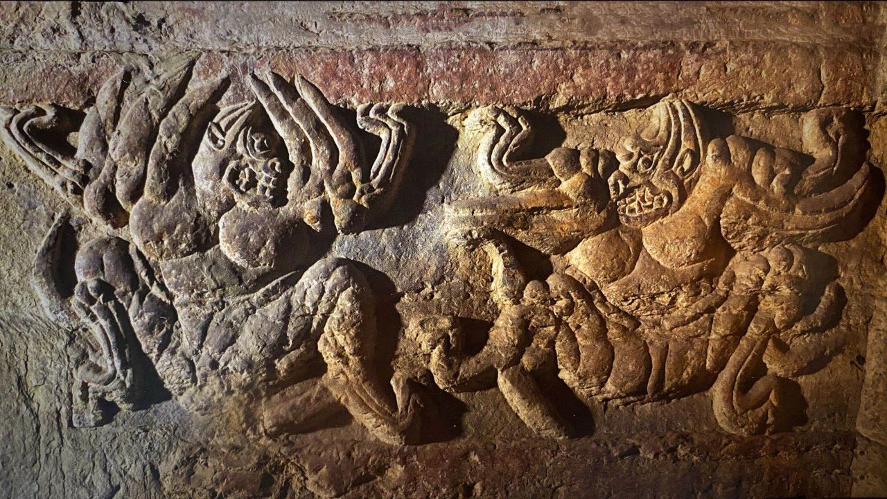 第一个看点就是帝后礼佛图。它雕刻的内容是北魏皇室家族到寺院礼佛时那种宏大的场面,巩义石窟寺现存礼佛图十五幅,分别雕刻于一号窟、三号窟和四号窟内的南壁,也就是从南侧正门进去之后,左右手的两侧位置的石壁上,礼佛图以独特的构图形式和流畅有力的刀法,在雕塑史上辉映出独树一帜的光芒。