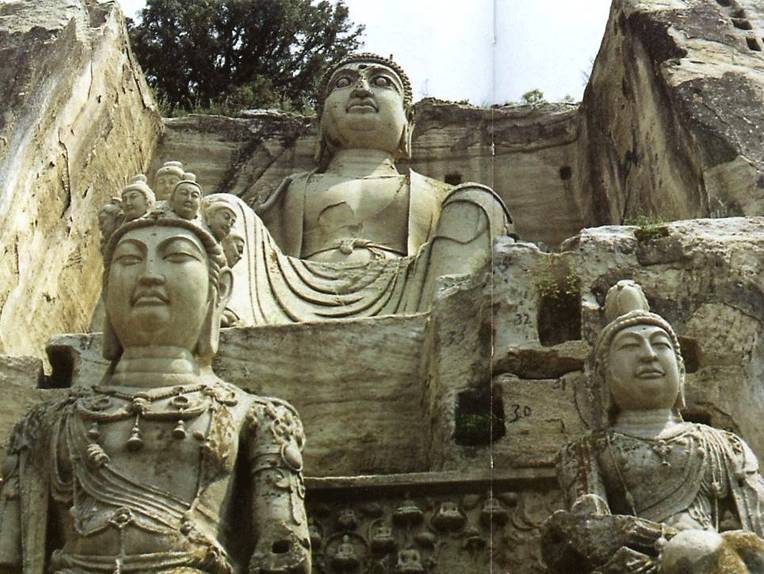 石窟,这种通过人工雕凿在整座山体上的很特殊的宗教建筑形式,其最初起源是在公元前12世纪时的印度。它的起源与公元前6世纪佛教在印度诞生后僧侣们的佛教事务活动有着很直接的关系。公元前3世纪后,印度佛教首先传入我国西南少数民族居住的地区;到西汉末年时,才逐渐传入我国中原地区。中国有佛寺,乃始于东汉明帝时(58-75)的洛阳白马寺。而中国有佛教石窟,则最初始于两晋时期的我国西北今新疆天山南麓地区。此后不久,至南北朝时,佛教石窟又迅速通过河西走廊今甘肃一带逐渐发展到了北魏拓跋氏政权所控制的山西高原之上。在此之前,一般的佛寺建筑则早在东汉时业已发展到了山西境内。如洪洞广胜寺即始建于东汉建和元年 (147)。到南北朝时,佛寺建筑在山西境内已经十分繁盛。这实际上为佛教石窟在山西落脚奠定了一个非常和谐的氛围与基础。