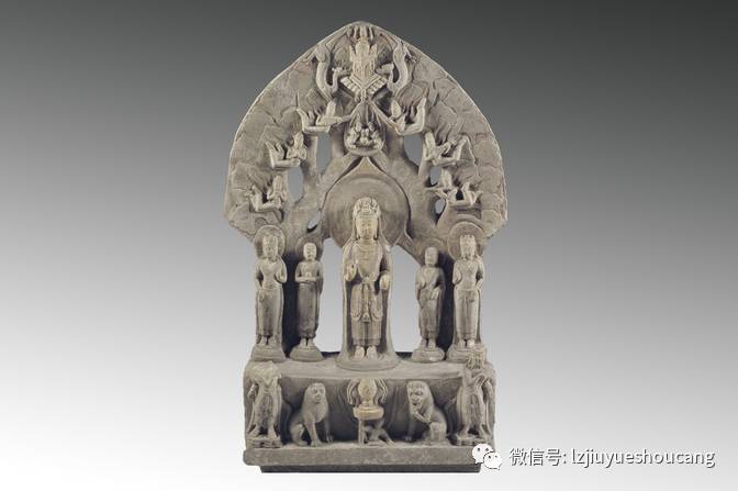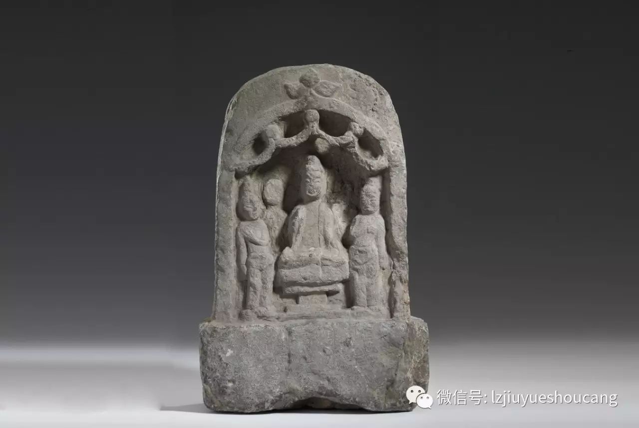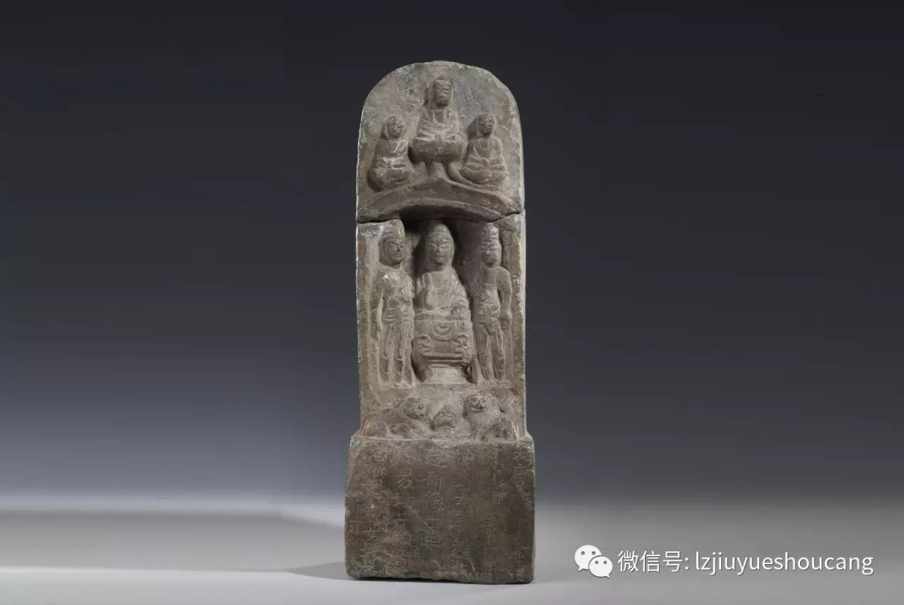 通高25.5厘米,宽17厘米,厚7.5厘米。山西博物院旧藏。青石质。拱形龛楣,楣尖处束一莲,楣面素面,楣内侧饰简化的联珠纹样。主像高肉髻,面相长圆清瘦,着通肩大衣,结跏跌坐于须弥台座上,右手施无畏印,左手作降魔触地印。其左右两侧胁侍菩萨头戴高冠,面相长圆,下着长裙,一手抚胸,一手置于身侧,跣足立于台座上。主像后侧两弟子,面相模糊,合掌肃立。台座前侧隐约可辨“咸亨二年”字样,其余字迹漫漶不清。