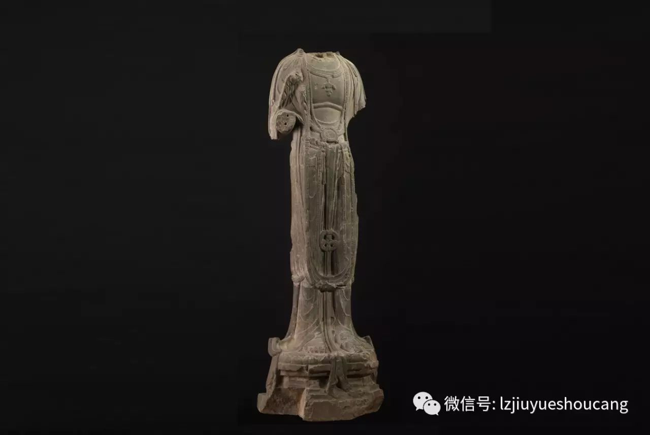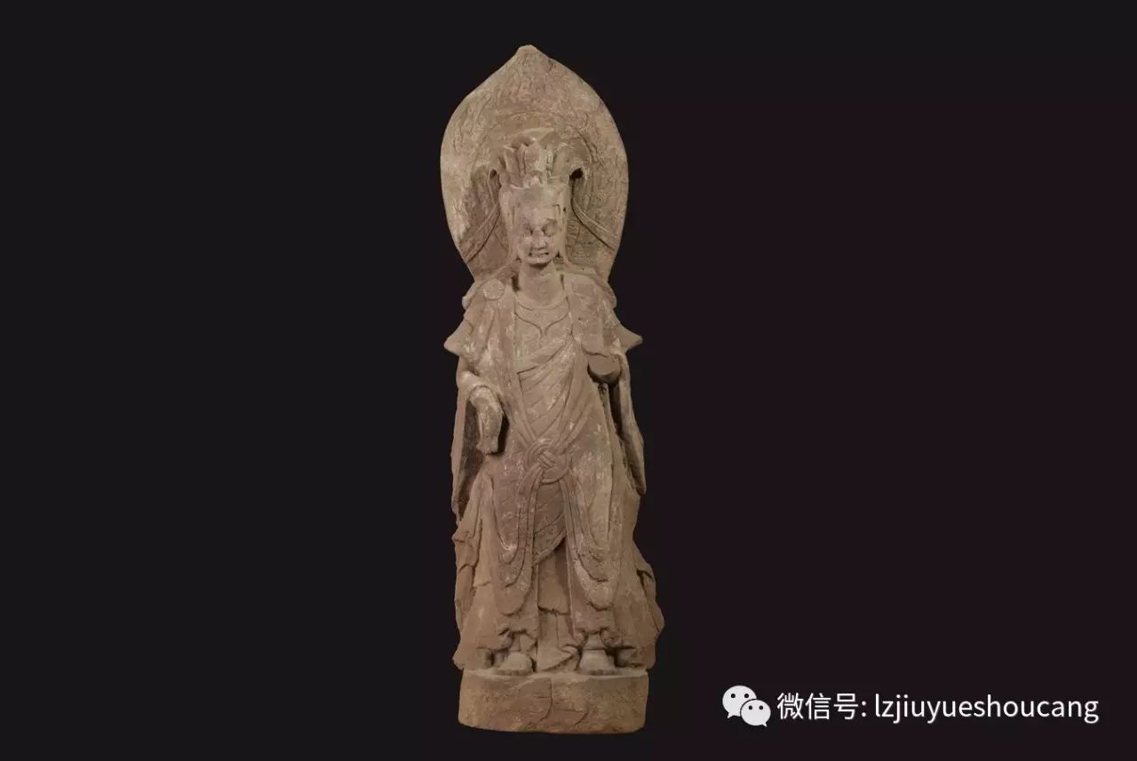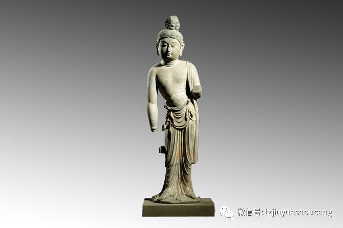 高121厘米,宽45厘米,厚16厘米。山西省左权县出土。菩萨头戴宝冠,跣足而立。面方圆,容貌清秀,头后为桃形头光,身着褒衣,帛衣交于腹部,系一花结,上胸袒露,双臂缺失,臂上飘带自然垂于脚下。