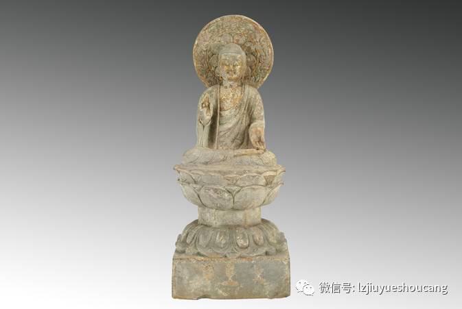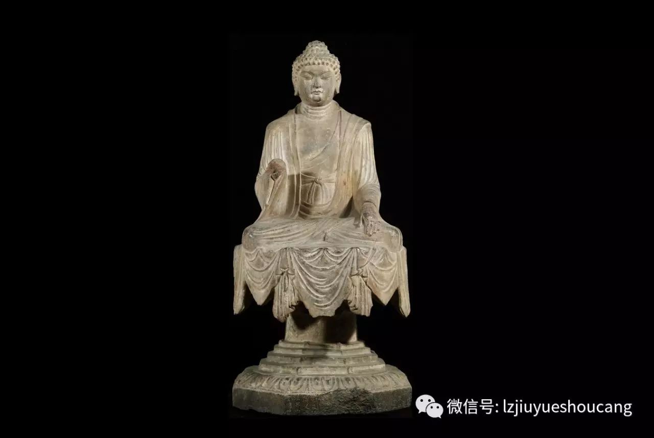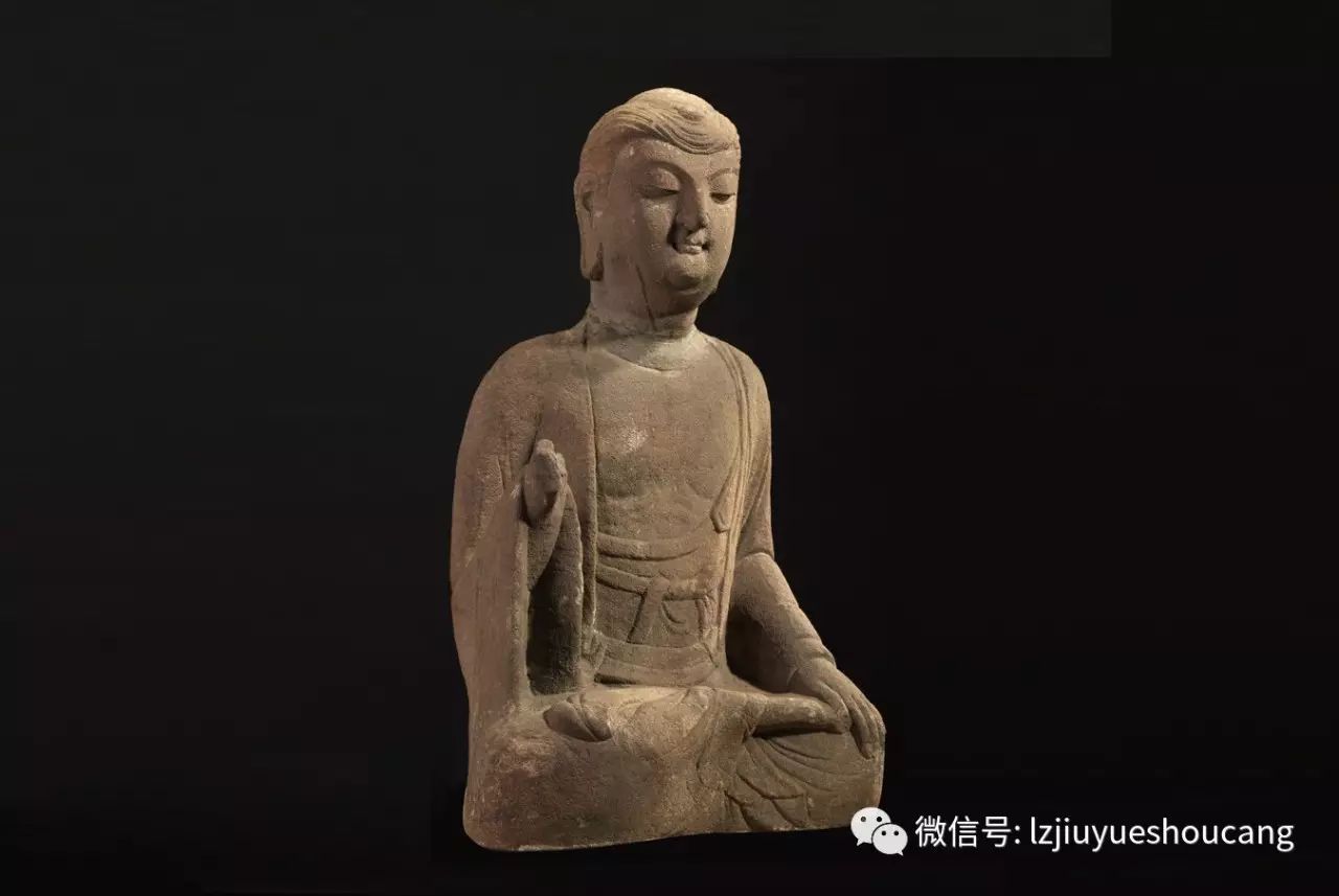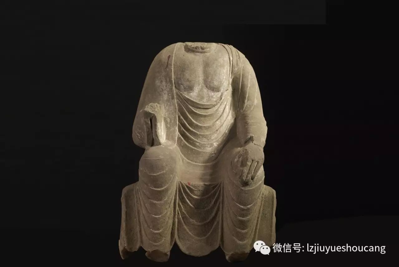 高69.5厘米,宽41厘米,厚25厘米。1957年山西省阳泉市征集。身着通肩衣,袒胸,结跏跌坐。脸型丰圆,弯眉细目,目光下视,嘴唇微闭,长耳下垂,神情怡然,右臂上举,手已残,左手轻抚足尖,坐姿松弛,衣褶自然。