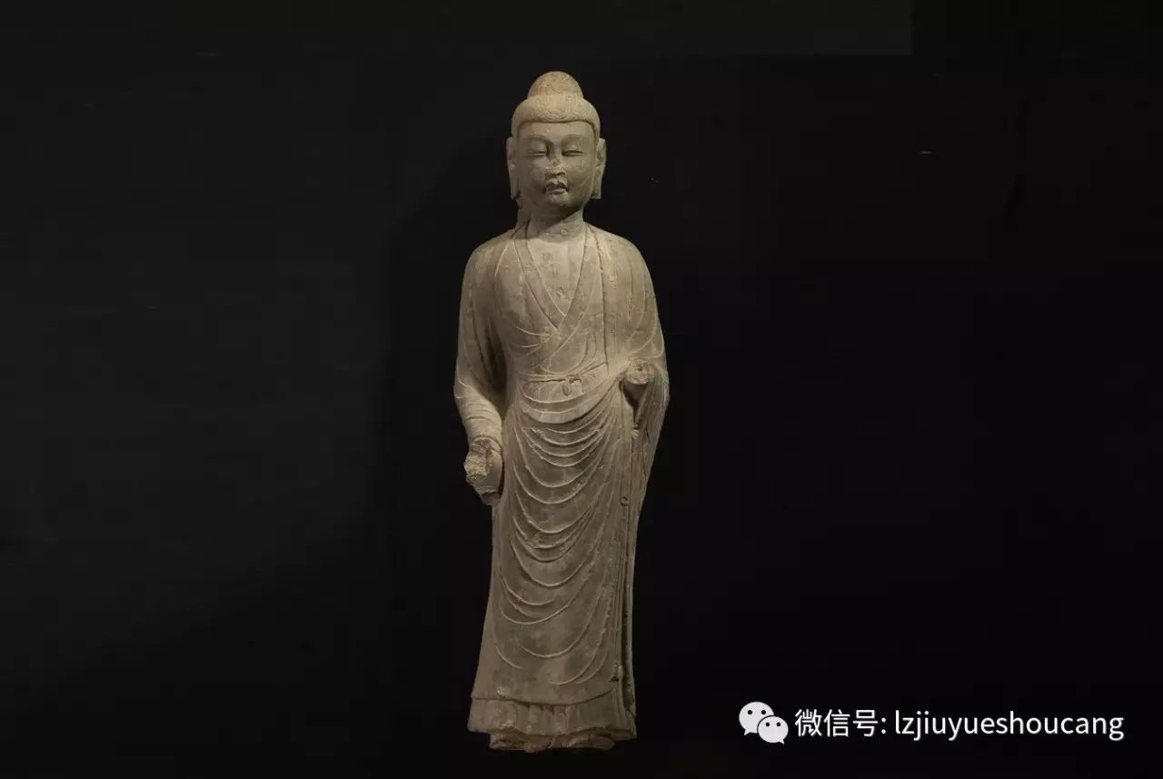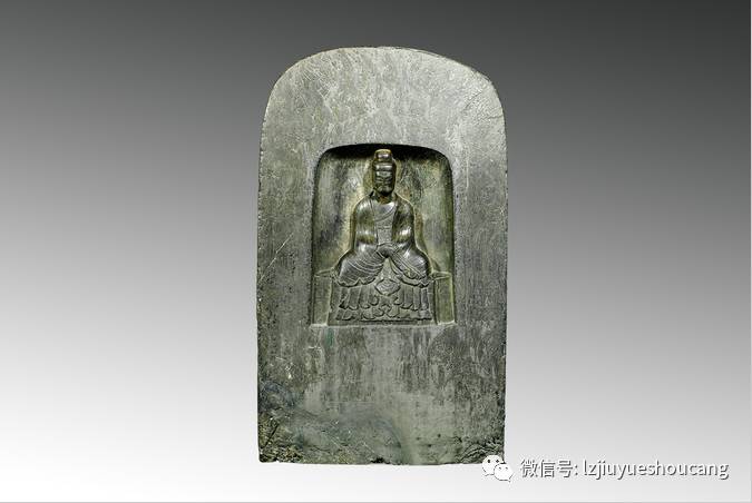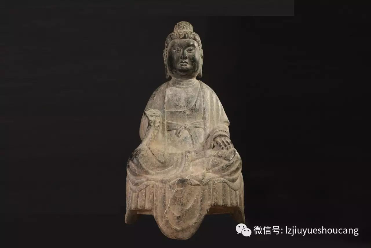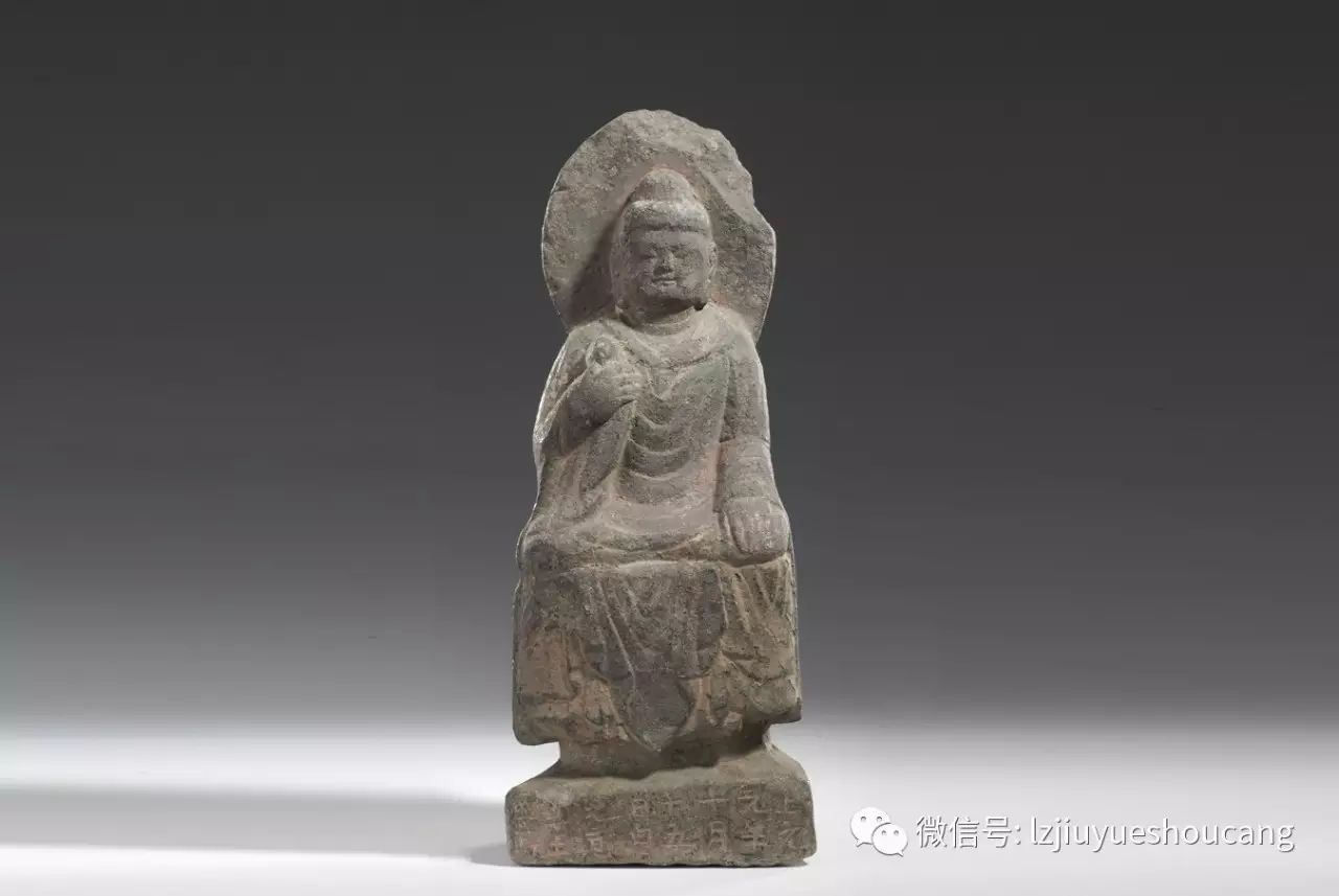 高69.5厘米,宽41厘米,厚25厘米。1957年山西省阳泉市征集。身着通肩衣,袒胸,结跏跌坐。脸型丰圆,弯眉细目,目光下视,嘴唇微闭,长耳下垂,神情怡然,右臂上举,手已残,左手轻抚足尖,坐姿松弛,衣褶自然。