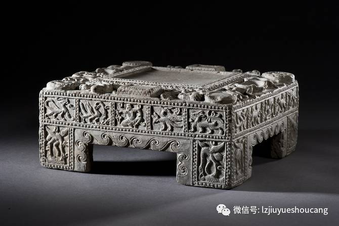 高8.5厘米,长21.2厘米,宽21厘米。1970年大同市南郊出土。浅灰色细砂岩雕成。砚面中心为方形砚池,周边饰连珠纹和莲瓣纹,砚池两侧各有一耳杯形水池和方形笔舔,其两端有成双的鸟兽作饮水状。对角有莲花形笔插。其间雕人物图案四组五人,有骑象、舞蹈、角抵等内容。侧面各雕人物、动物等。砚底雕莲花一朵,周边围以小莲花8朵。这是北魏石刻艺术的高水平佳作。