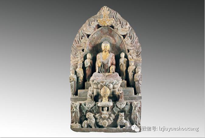 高46厘米。1954年太原市花塔村出土。释迦佛坐于仰莲座,全身贴金,施赭红彩。舟形背光周边浮雕宝塔、飞天,底座雕莲花化生手托博山炉供养。背面有彩绘佛像。