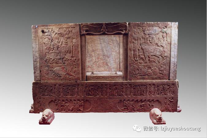 通高217厘米,通长295厘米,宽220厘米。1999年太原市王郭村开皇十二年(592年)虞弘墓出土。整体呈仿木构三开间歇山顶房屋。汉白玉石,由底座、椁身、顶三部分组成,以及支撑石椁的石狮8件。石椁内外皆雕刻并施彩绘,由50多个单体图案组成,内容有宴饮、乐舞、射猎、家居、行旅等。图案中的人物深目高鼻黑发,属于地中海高加索人种,服饰、器皿、乐器、舞蹈及花草树木等,均具有浓厚的中亚和波斯风格,部分画面带有祆教的内容。展现了墓主人不同的文化背景,是研究中外文化交流的重要史料。虞弘是中亚鱼国人,北齐时入华,曾任职于北齐、北周和隋三个朝代。