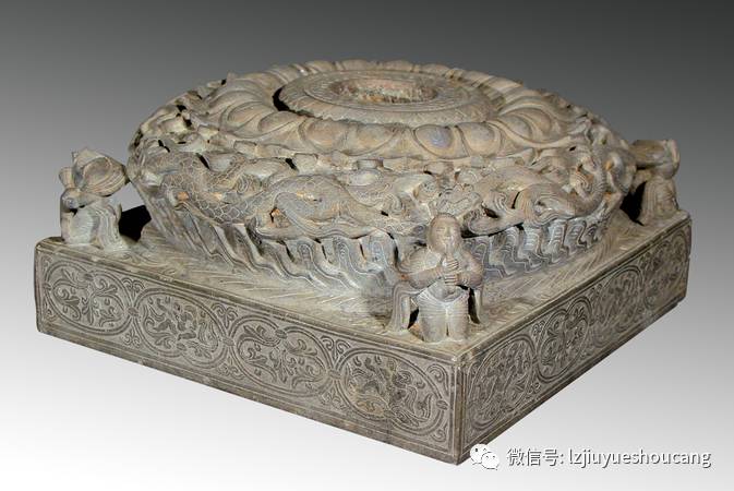 通高16.5厘米,底座边长32厘米,柱孔直径7厘米。1965年大同市石家寨村太和八年(484年)司马金龙墓出土。其中一件柱础为浅灰色细沙石质,方形底座,其上呈覆盆形,顶部高浮雕莲瓣,中心有圆形插孔。周边雕蛟龙穿行于群山之间。方座四边浅浮雕忍冬纹和云纹,方座四角上各有一圆雕伎乐童子,分别作击鼓、吹觱篥、弹琵琶和舞蹈状。柱础底座四边浅浮雕缠枝莲,其间为伎乐人物。装饰内容吸收了佛教、西域及其他外来文化的因素,雕工精美,玲珑脱俗,是北魏雕刻艺术品中的精品。共出土4件,大小、纹饰略有不同,是漆画屏风(木板漆画)的插座。司马金龙之父司马楚之是东晋宗室,因宫廷斗争而转投北魏,娶北魏公主,被封为琅琊王。