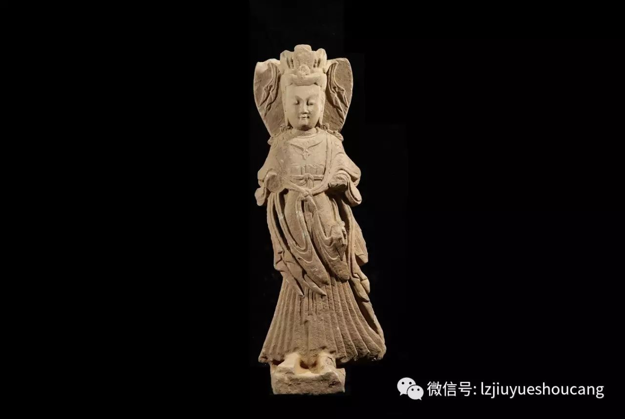 通高114厘米,宽34厘米,厚24厘米。山西省侯马市出土。头部缺失,身披帛衣,袒胸,项戴项圈及联珠璎珞,璎珞在腹部交叉并垂至膝盖以下,腰身细长,婀娜妩媚,两臂缺失,下着长裙,衣纹繁复,垂至脚下,跣足立于六边形须弥座上。其雕塑与装饰手法充分体现了雍容华贵的盛唐气象。