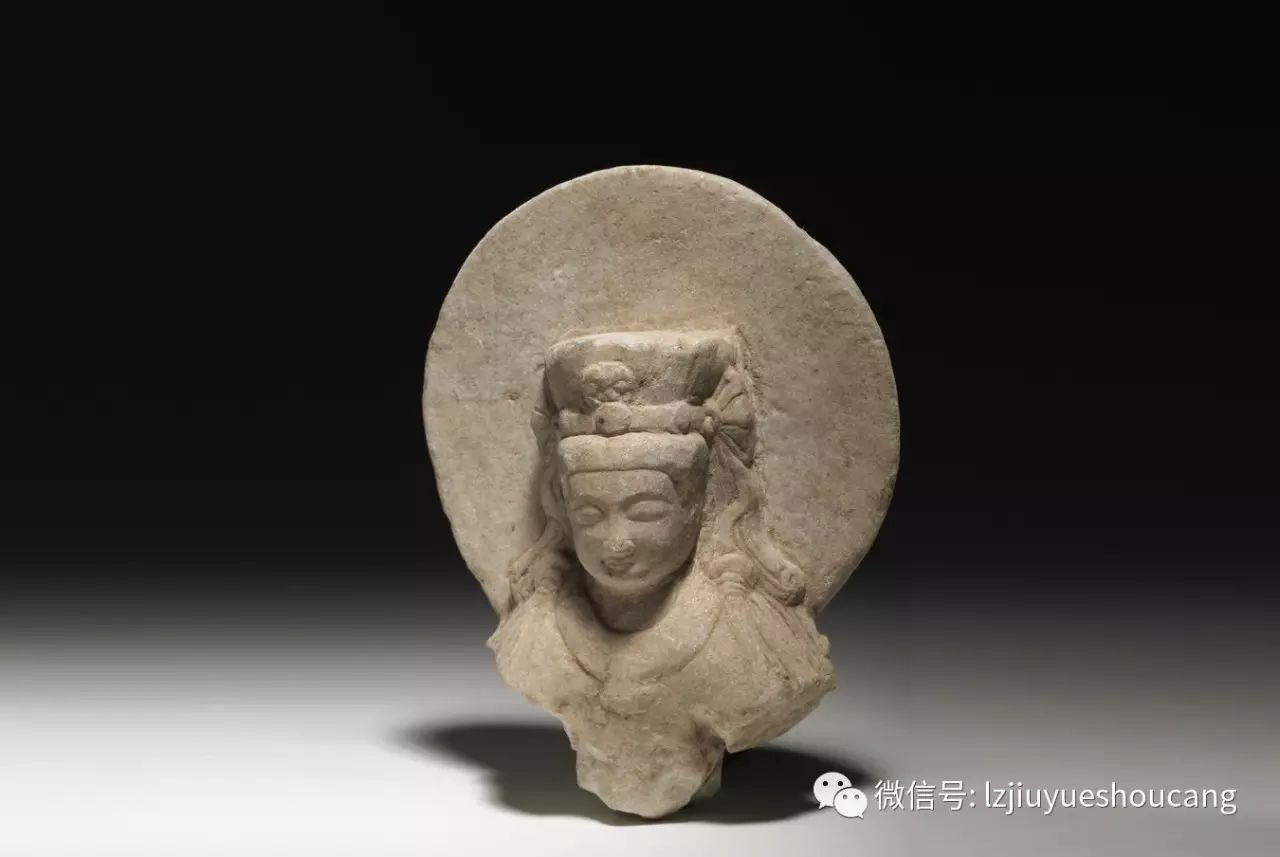 通高17厘米,宽13厘米,厚6厘米。1979年山西省昔阳县静阳村出土。白石雕,菩萨头戴宝冠,宝缯蜿蜒垂至两肩,脸型方圆,慈眉善目,眼睑下垂,帔帛交叉于胸前,身后为圆形头光。