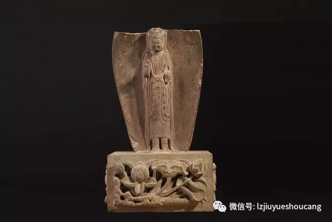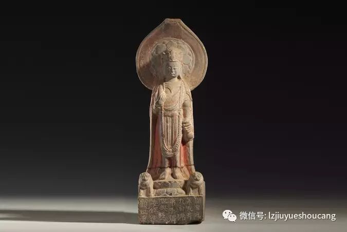 通高57.5厘米,宽32.3厘米,厚31厘米。山西博物院旧藏。菩萨头戴高冠,脸型方圆,双目圆睁,肩披飘带,跣足直立于石座之上。帔帛于胸腹前交叉挽结出花饰。背光顶部残缺,隐约可见后代的墨书题记“观世音菩萨……有佛有法有僧……”等字样。莲花石座为后配。