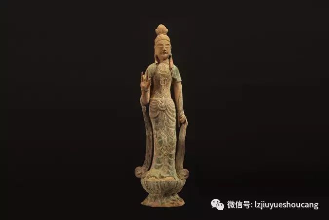 高69.5~70.5厘米。山西省介休市出土。三件,灰白坩泥捏塑,脸、手、足露胎,其余施绿釉。姿态略不相同,呈站立状,竖高发髻,眉目清秀,身材纤瘦,满饰璎珞,腹部微曲,飘带垂于脚下,身着长裙,立于仰覆莲座上。菩萨姿态动感飘逸,是大唐菩萨造像丰腴俊秀的先声。