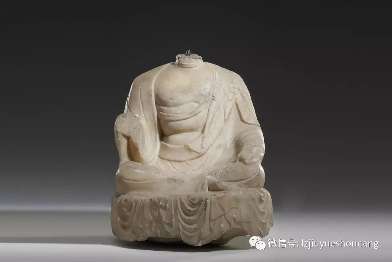 残高25.5厘米,宽19厘米,厚20厘米。刘静山先生捐赠。白石雕。佛像头部缺失,体态丰满,着通肩式大衣,双手残,结跏跌坐于圆形台座上,下身衣褶悬搭于座前,衣纹曲折生动。