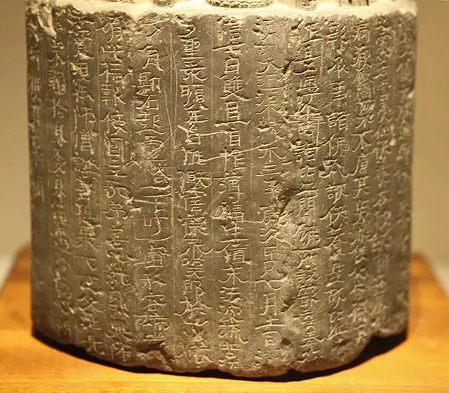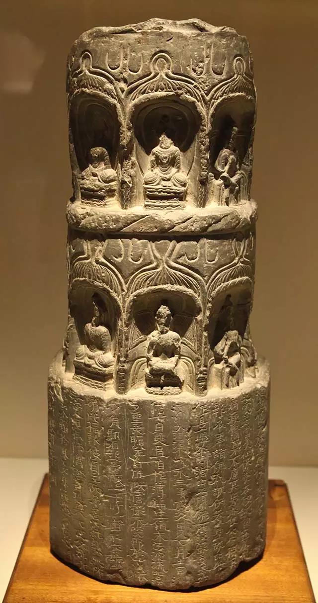 上面两张图片中的是一位名叫白双且的居士所造石质小佛塔。石塔现仅存塔基、塔身和塔肩三层。底层八角形塔基上雕刻施主的发愿文和佛经,中间圆柱形塔身雕有六尊佛坐像、一尊半跏趺坐思惟菩萨像和一尊交脚菩萨像,上层覆钵形塔肩雕刻七尊佛坐像和一尊交脚菩萨像。石塔下端为榫头,说明塔基下原有塔座。