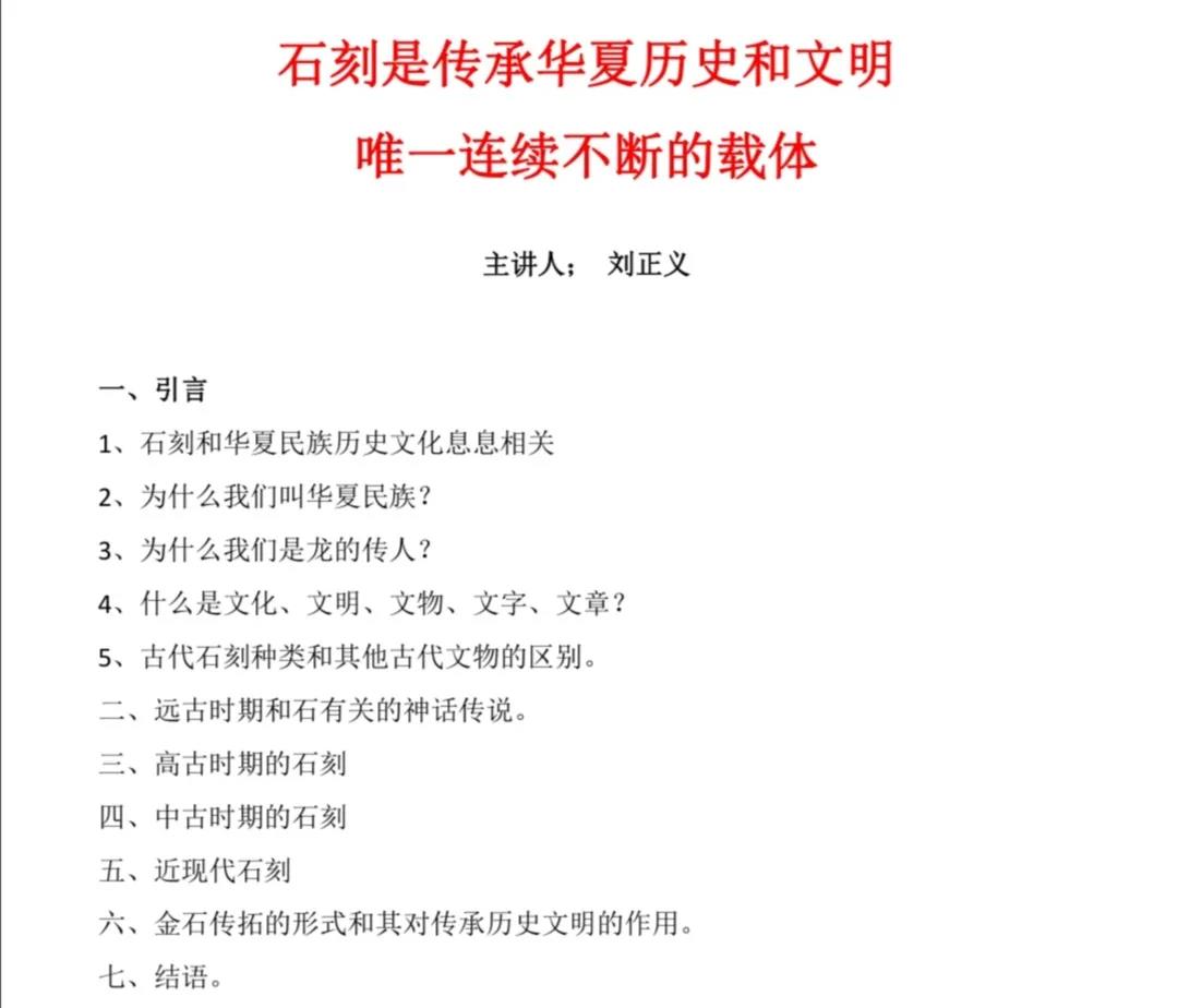 主讲人刘正义先生从远古、高古、中古和近现代人类发展各个历史时期,深刻地阐述了石刻和人类历史、文化、文明的关系,以大量的实物证据证明了《石刻,是传承华夏历史和文明连续不断的载体》的主题思想,受到了与会者的认可和褒扬。特别是关于“盘古开天地”、“女娲补天”等远古神话和“文化、文明、文物、文字、文章”的解读及“华夏”、“龙的传人”、“门挡户对”的由来,更是别开生面、引起了大家的极大兴趣。