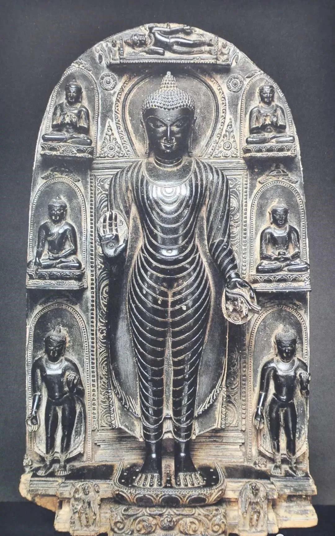 佛立像及佛传图 十世纪 黑绿泥石 高76.2公分
