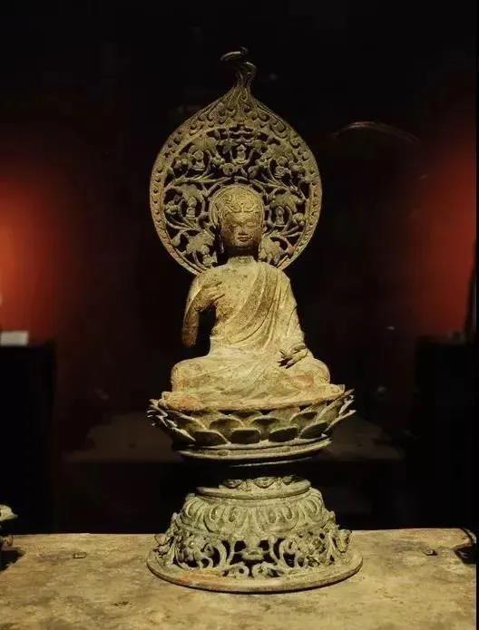 十六国早期的莲花座花瓣尖略宽长,覆莲两层莲瓣叠压,整体简洁,拙朴,这也是后来北魏时代的特点。头光部分基本以彩绘莲花为主,而少有立体的莲花雕塑,花型多为内外环状。