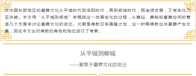 北中国东部地区的墓葬文化从平城时代到洛阳时代,再到邺城时代,既连续发展,又有变化乃至突破。其中都城所在的平城、洛阳、邺城、晋阳墓葬最具代表性。墓葬空间大致相当于地面建筑空间,礼仪性与实用性并重。考察从平城到邺城墓葬文化之变化,当先从礼俗入手。礼俗必须在一定的空间之中方可展开。礼俗既要迁就于空间,空间也需在随礼俗变化而适当调整。北朝是佛教日渐昌隆之世,佛教势力之盛,中国人对佛教的独特理解,都导致佛教与墓葬产生交集,但二者之间并非递进式发展。