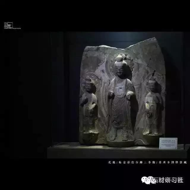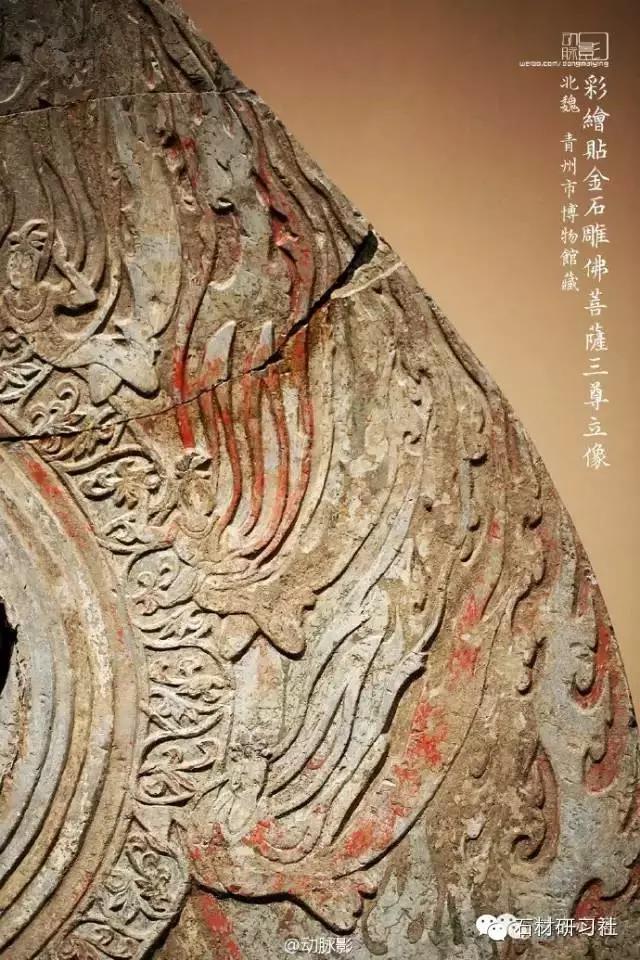 ▲北魏一佛二菩萨贴近彩绘石雕(图片来自动脉影)