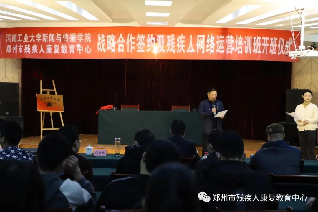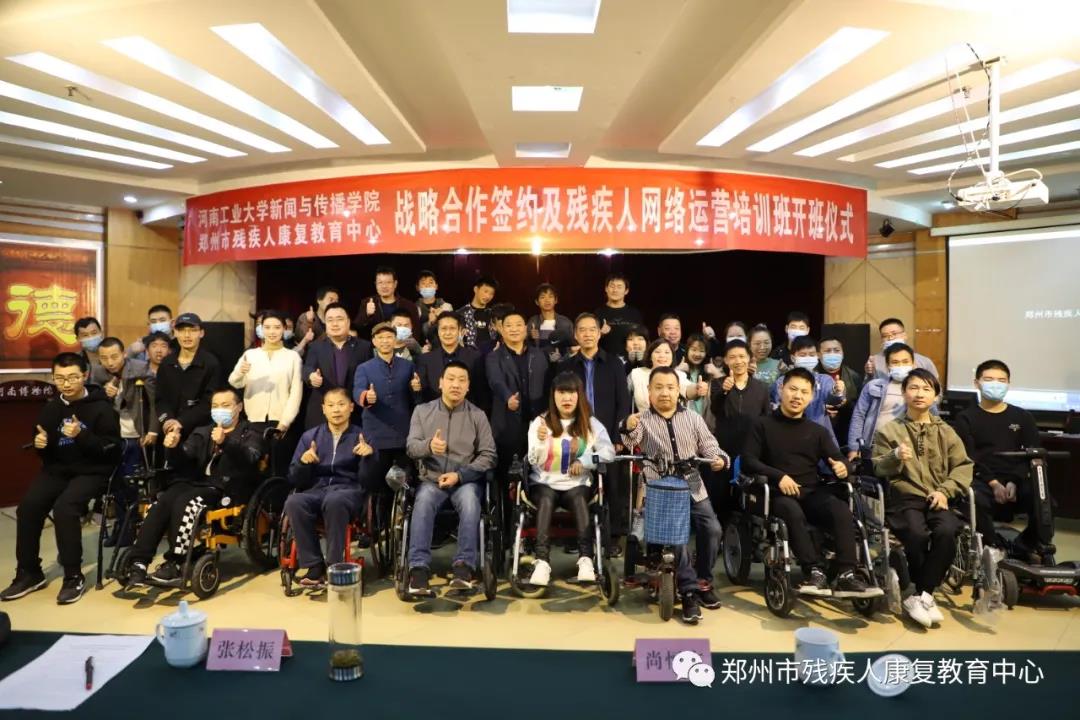 4月14日上午,郑州市残疾人康复教育中心与河南工业大学新闻与传播学院战略合作签约,双方将在康复教育中心联合开办残疾人网络运营培训班,帮助残障人士更好地灵活就业,居家创收。河南省广告传媒业协会监事长、河南工业大学新闻传播学院党委书记尚恒志教授,郑州市残疾人联合会副理事长张松振,河南工业大学新闻传播学院副院长郑冬晓教授,郑州市残疾人康复教育中心主任刘正义,河南工业大学新闻传播学院院长助理、省广告传媒业协会高校专家委员会办公室主任陆南老师共同参加了开班典礼。