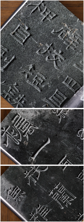 所有石楬拓片均由著名传拓专家孔震先生亲手拓制,历时数月得以完成。所拓字口清晰,线条劲挺,拓墨层次分明,对石楬的残损用淡墨拓出更具有立体感。
