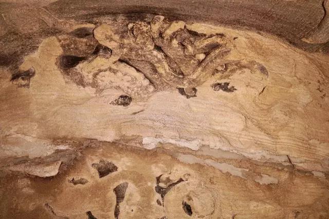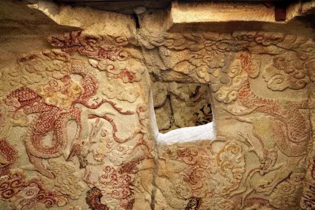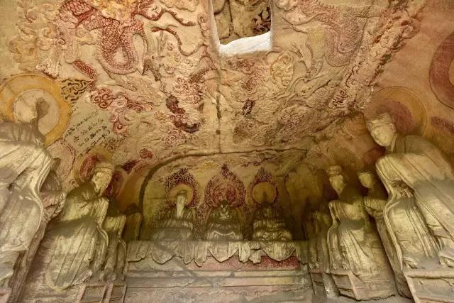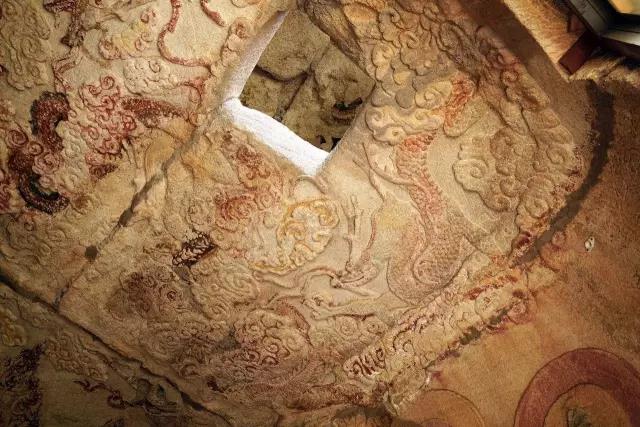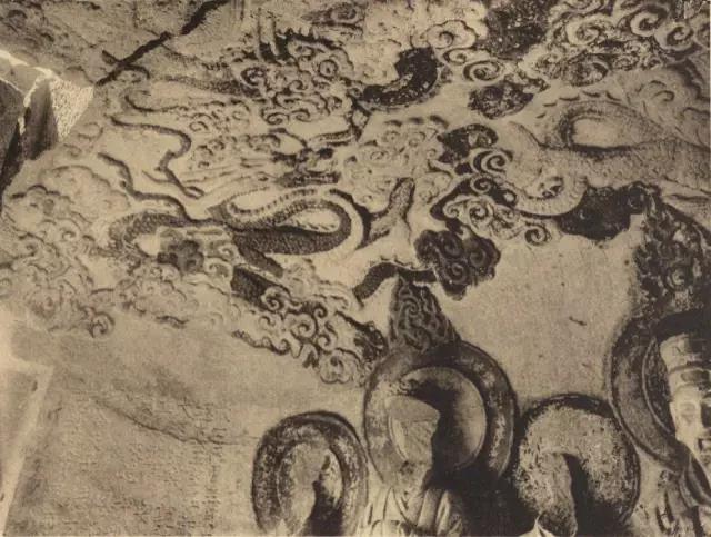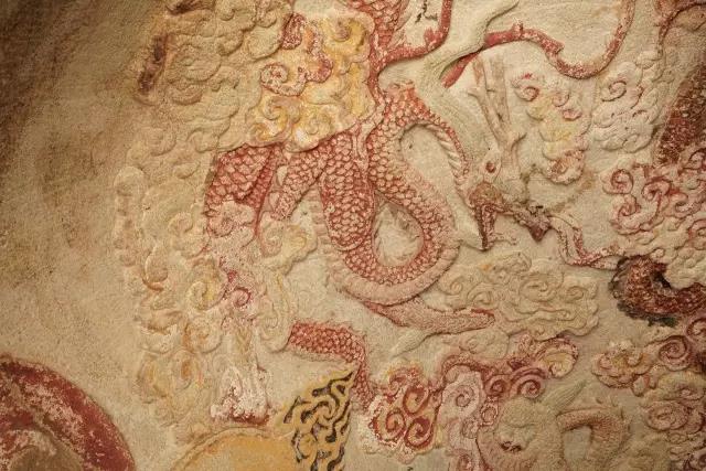 三清窟藻井雕刻五条飞龙,四条分居藻井四角,拖尾徘翔,龙首回顾,顾盼于正中的龙;正中的这条张牙舞爪,昂首向前直冲窟门,腾云驾雾似要冲天而去。