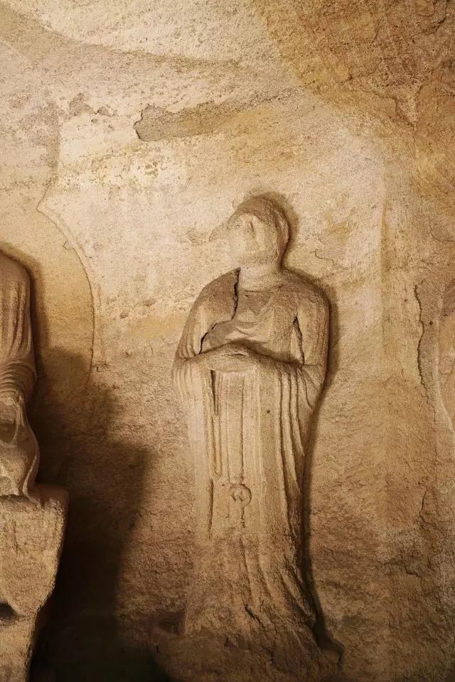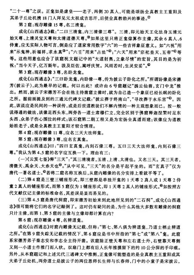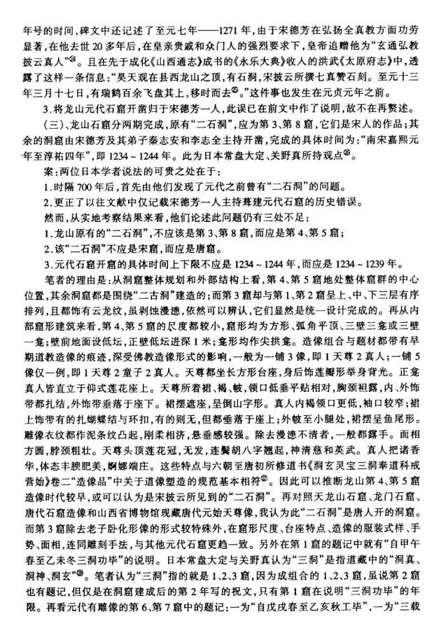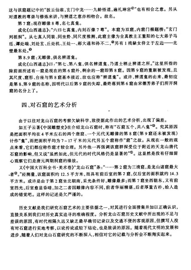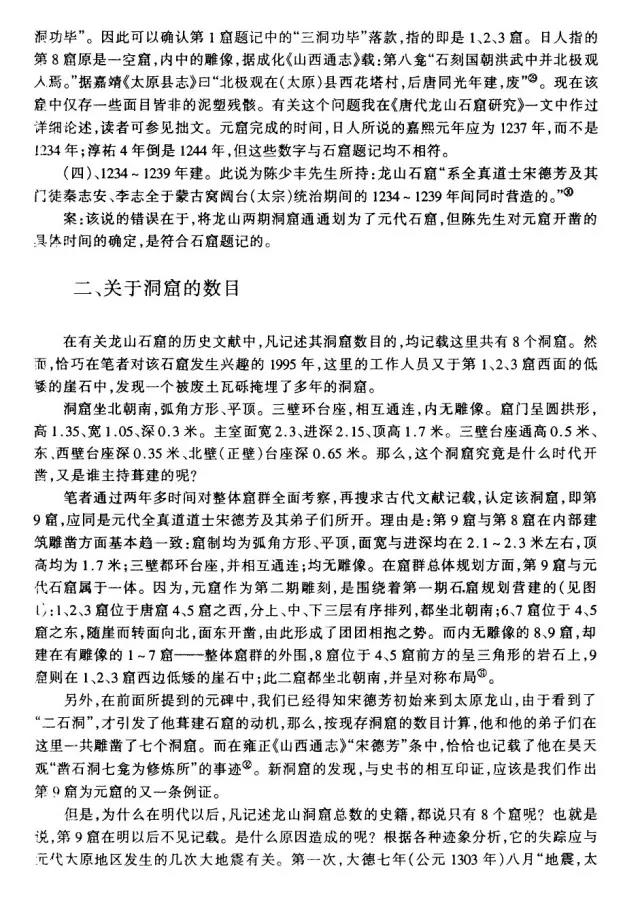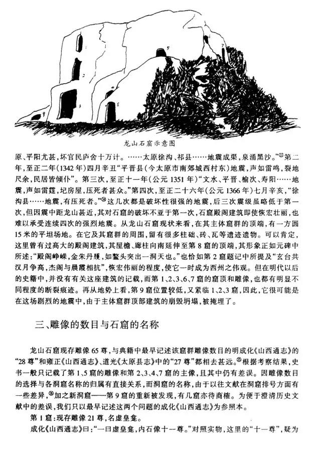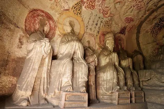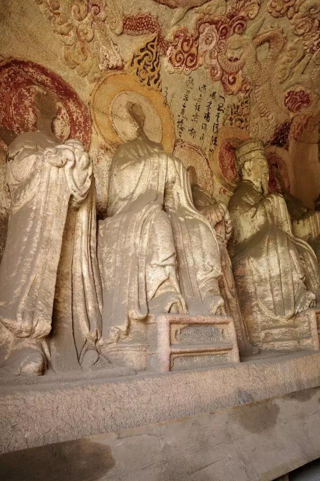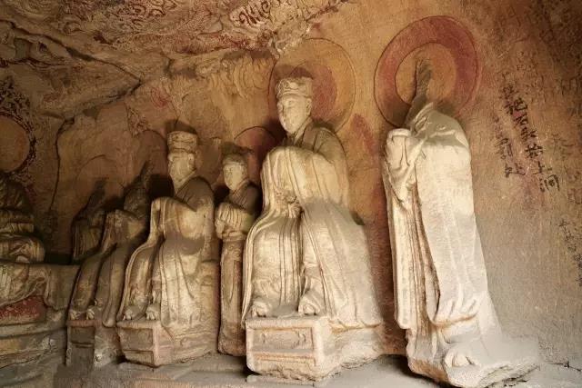 龙山石窟是我国现存规模最大,保存最完整的道教石窟,共九窟,开凿于唐元明三朝。其中,三天大法师龛、玄真龛开凿于唐;虚皇龛、三清龛、卧如龛、披云子龛、七真龛开凿于元太宗六年至十一年(1234—1239),由全真教宋德芳(道号披云子)主持兴建;三皇龛和辩道龛开凿于明正德年间(1506—1521)。共有雕像60余尊。既有三清老祖等道家神仙像,又有全真派创始人王重阳等道教真人像。