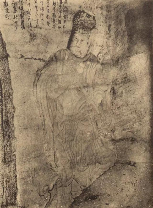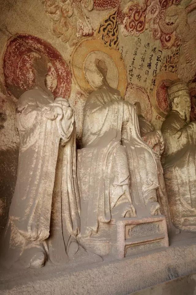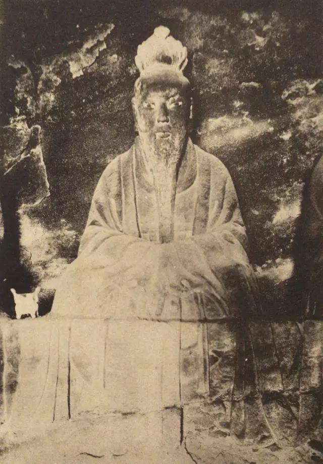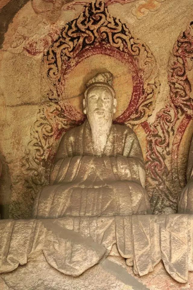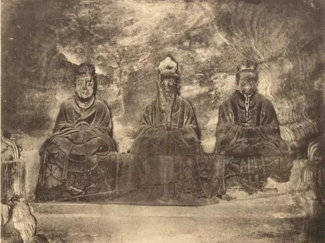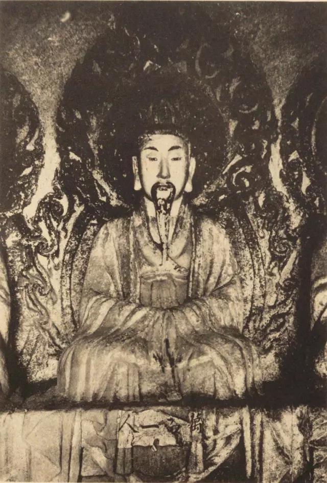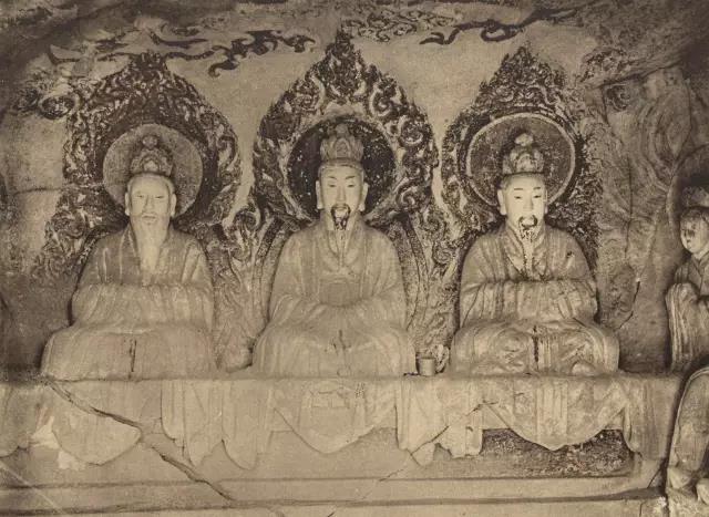 太上老君头戴芙蓉冠,面相温和慈祥,颌下有浓密的“V”形胡须。1924年之后,元始天尊与灵宝天尊的头颅遭盗割,从常盘大定的照片可知,元始天尊、灵宝天尊面相清癯,眉清目秀,飘然有道家仙气。