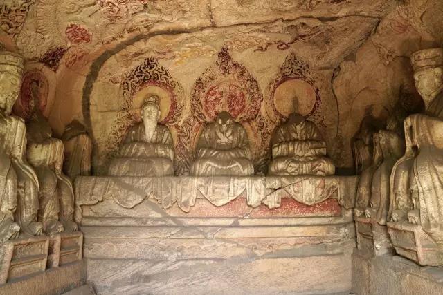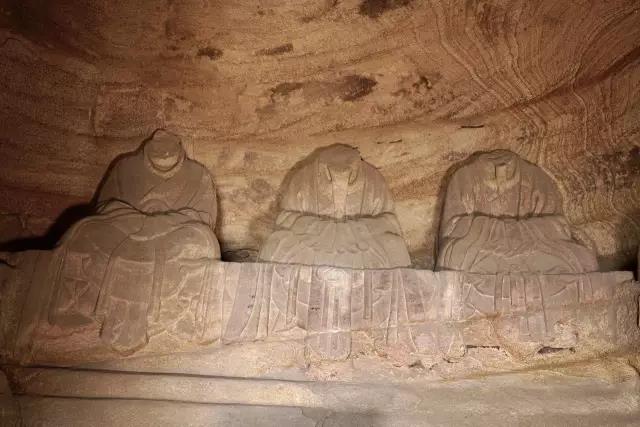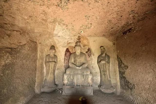 第八窟为三皇龛,始建于明代,坐北朝南,弧角方形,三面台座,三皇指神农、伏羲、黄帝,道教称三皇为天皇、地皇、人皇。