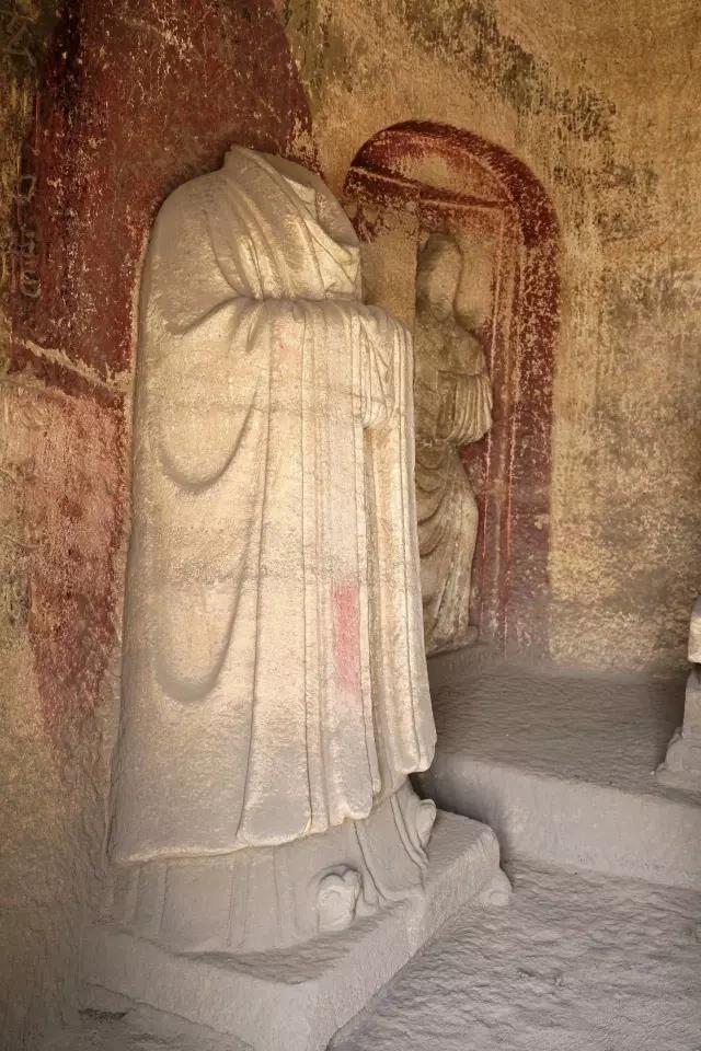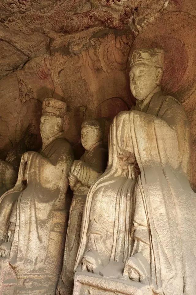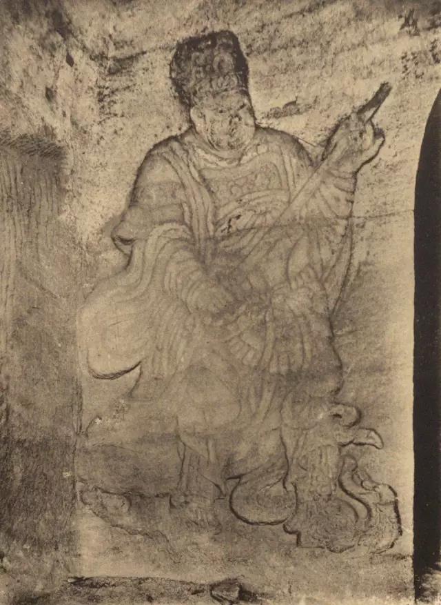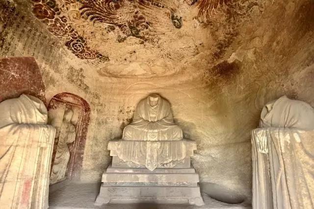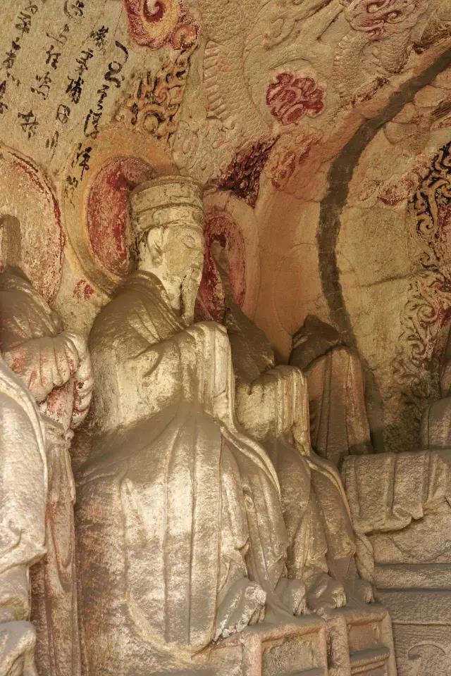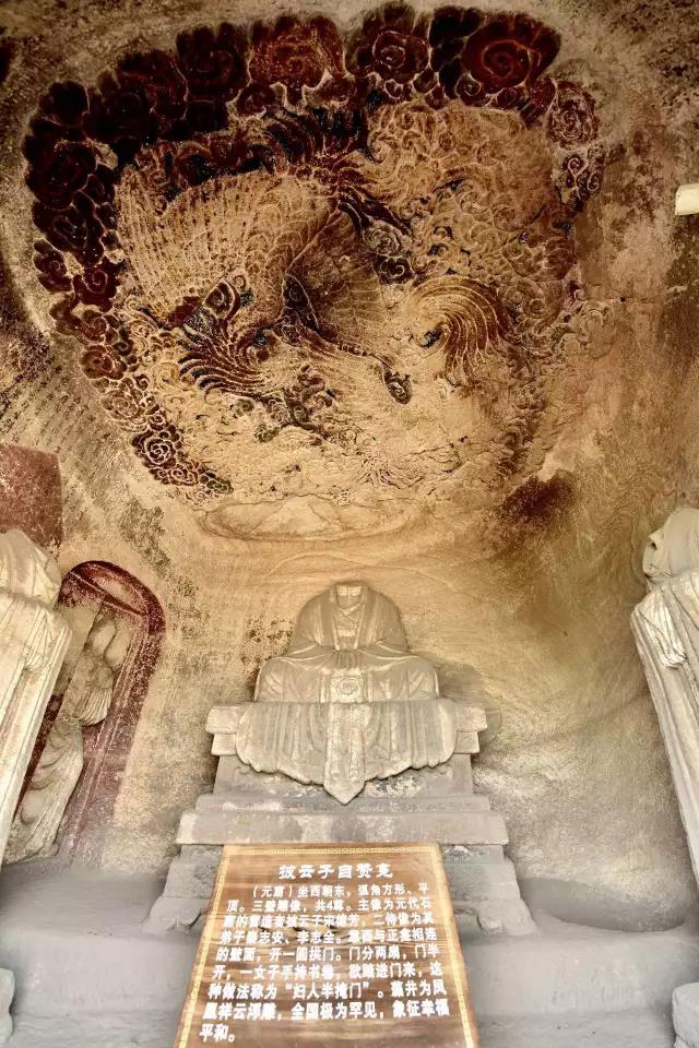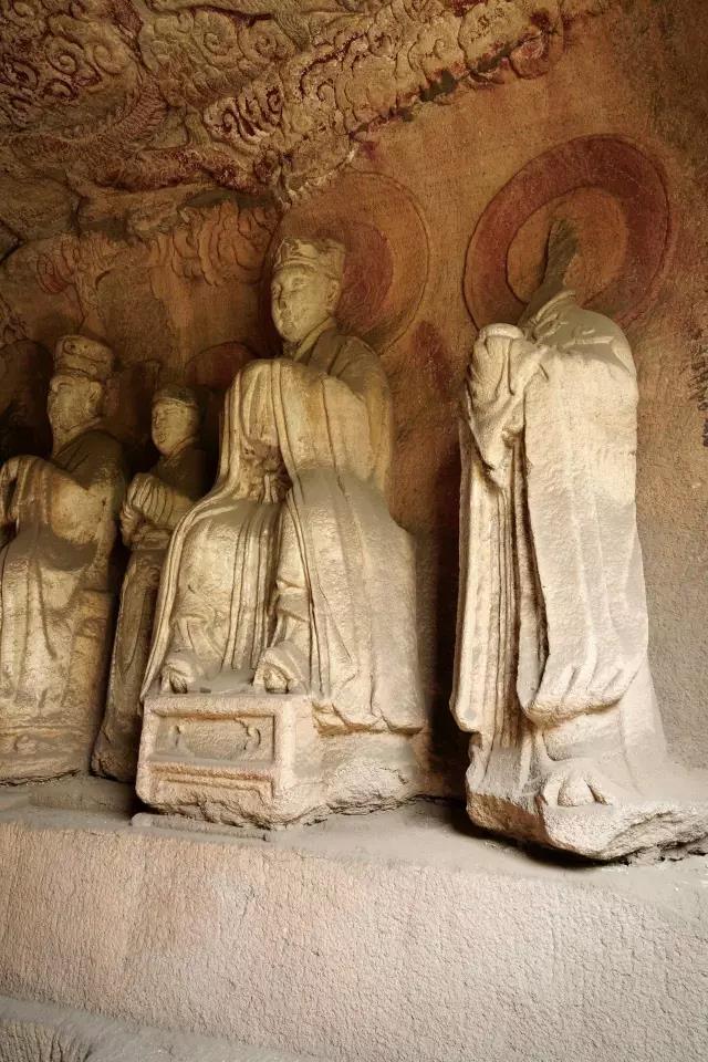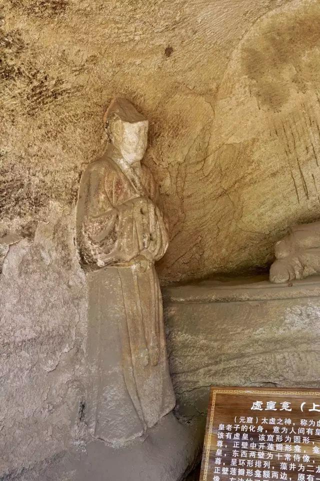 第一窟为虚皇龛,位置最高,窟高235厘米,深305厘米,窟中造像有21尊之多,窟平面圆形,正面雕龛,龛内雕有元始天尊坐像,头已不存,从常盘大定的照片看,天尊面相清癯,颌下一缕长须及胸,身着宽松的羽衣,趺坐于坛基之上,双手笼在袖中,宝珠形身光环绕他的身体,光中生有五道云气纹。两旁各雕有侍者像十尊,身披道袍,脚下流云缠绕,头上刻有光环,飘然恍若仙境,似为道府诸神作朝拜仪式。洞顶雕盘龙两条,已风化。