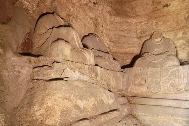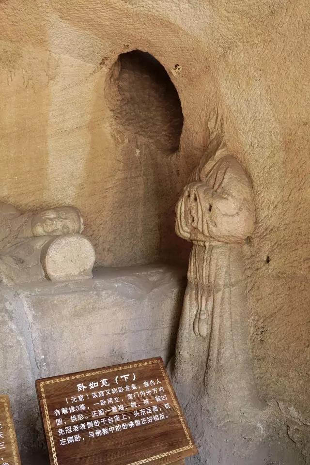 第三窟为卧如龛,高215厘米,深342厘米,窟内左右雕碣龛各一,正面雕一长方形高台,台上侧身卧像一尊,头东足西,左手拂腮而卧。这里相传是“披云子卧化地”,老者也由此被认为是宋德芳卧像。不过也有认为是祖师爷王重阳。