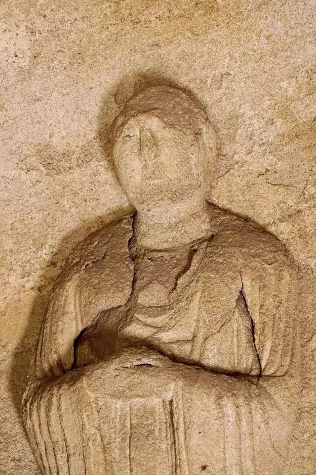 第六窟为披云子自赞龛,塑造了宋德芳与门人李志全、秦志安讲经论道的场景,正中的宋德芳头戴芙蓉冠,鼻梁直挺,下颌有三缕长须;李志全与秦志安上身着对襟衫,下身着裙,似正专心聆听恩师教诲。靠西壁面开圆拱门,一妇人手持书卷,欲踏进门来。此为元代“妇人启门”雕像。