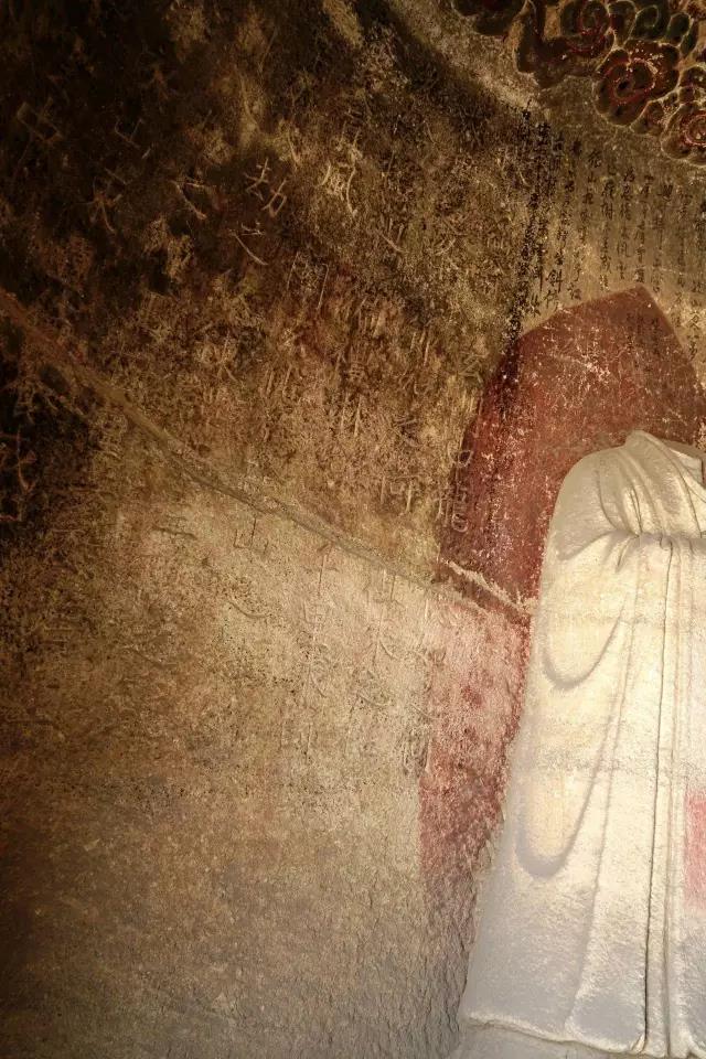这一窟被称为披云子自赞窟,源于窟中这则题记:“披云自赞。这个形骸许大,已是一场灾祸。被谁节外生枝,强要幻成那个。更分假象真容,便是两重罪过。只因眼病生华,毕竟有个甚么。自戊戌春至乙亥秋工毕,门人李志全稽道作颂。”石窟戊戌春(1238)动工,到乙亥秋(1239)完工,历时一年有余。